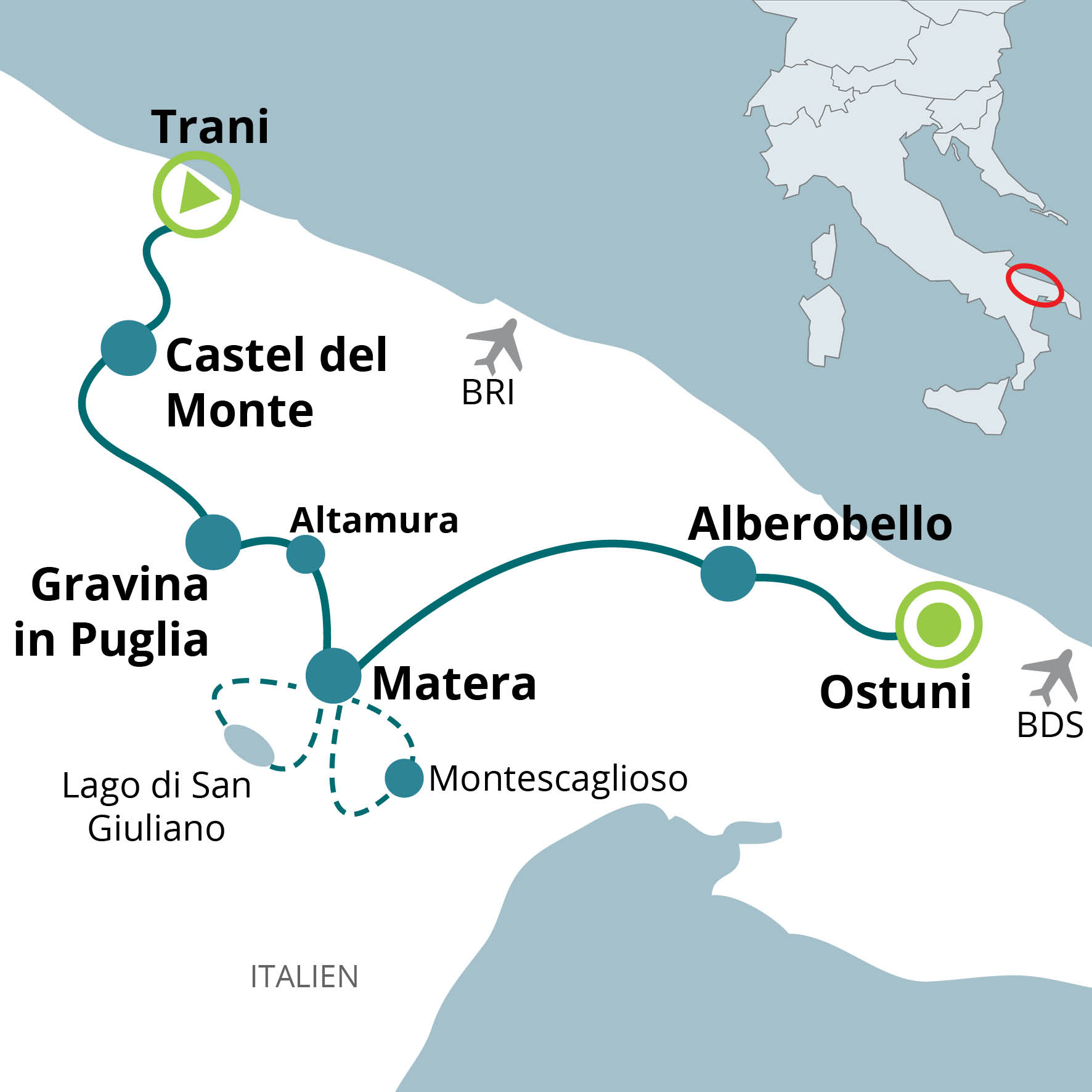 Auf der Fahrt durch das Tal des Flusses Bradano säumen hügelige Kornfelder Ihren Weg und Sie nehmen Kurs auf Matera, bekannt für die Höhlensiedlungen „Sassi di Matera“. Nach einer Nacht in Alberobello, der „Trulli-Stadt“, findet die Tour ihr glanzvolles Ende in der weißen Stadt Ostuni. Die Radreise führt zwar durch hügeliges Gelände, die Aufstiege – auf welche man vor allem in der Nähe von Ortschaften trifft – sind jedoch meist einfach und kurz. Die Strecke folgt Nebenstraßen mit geringem Autoverkehr, größtenteils asphaltiert und gut für Tourenräder geeignet.