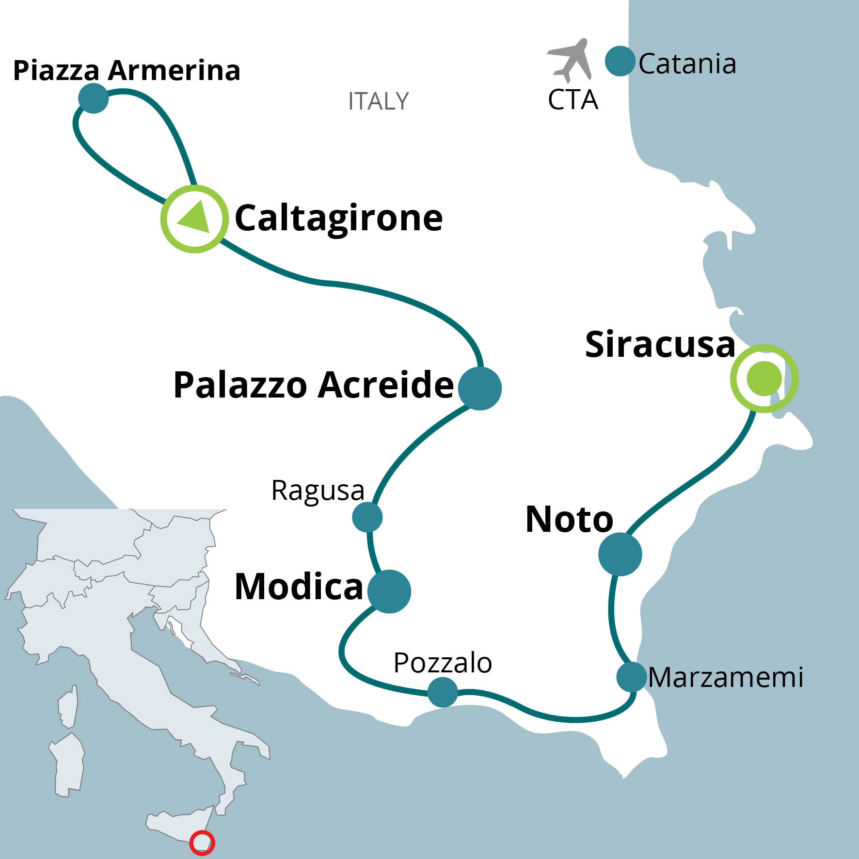 An itineray on this mythical island, between archaeological sites and baroque architecture. You will explore the south-east coastline as well as the hinterland, the Erei mountains and the Val di Noto which has been declared a UNESCO World Heritage Site in 2003.
