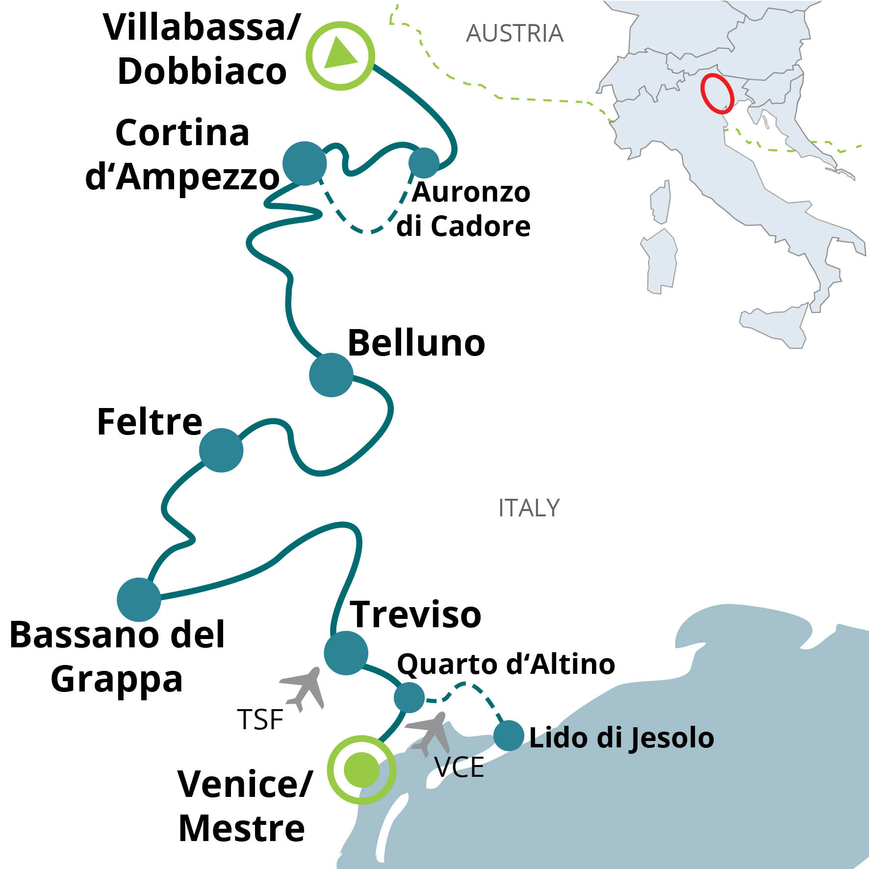 Da Belluno, piccolo capoluogo di provincia, il tour prosegue in direzione di Valdobbiadene e le colline della famosa area di produzione del Prosecco; superato un altro passo importante, San Boldo, continuerete a pedalare in direzione di Feltre.