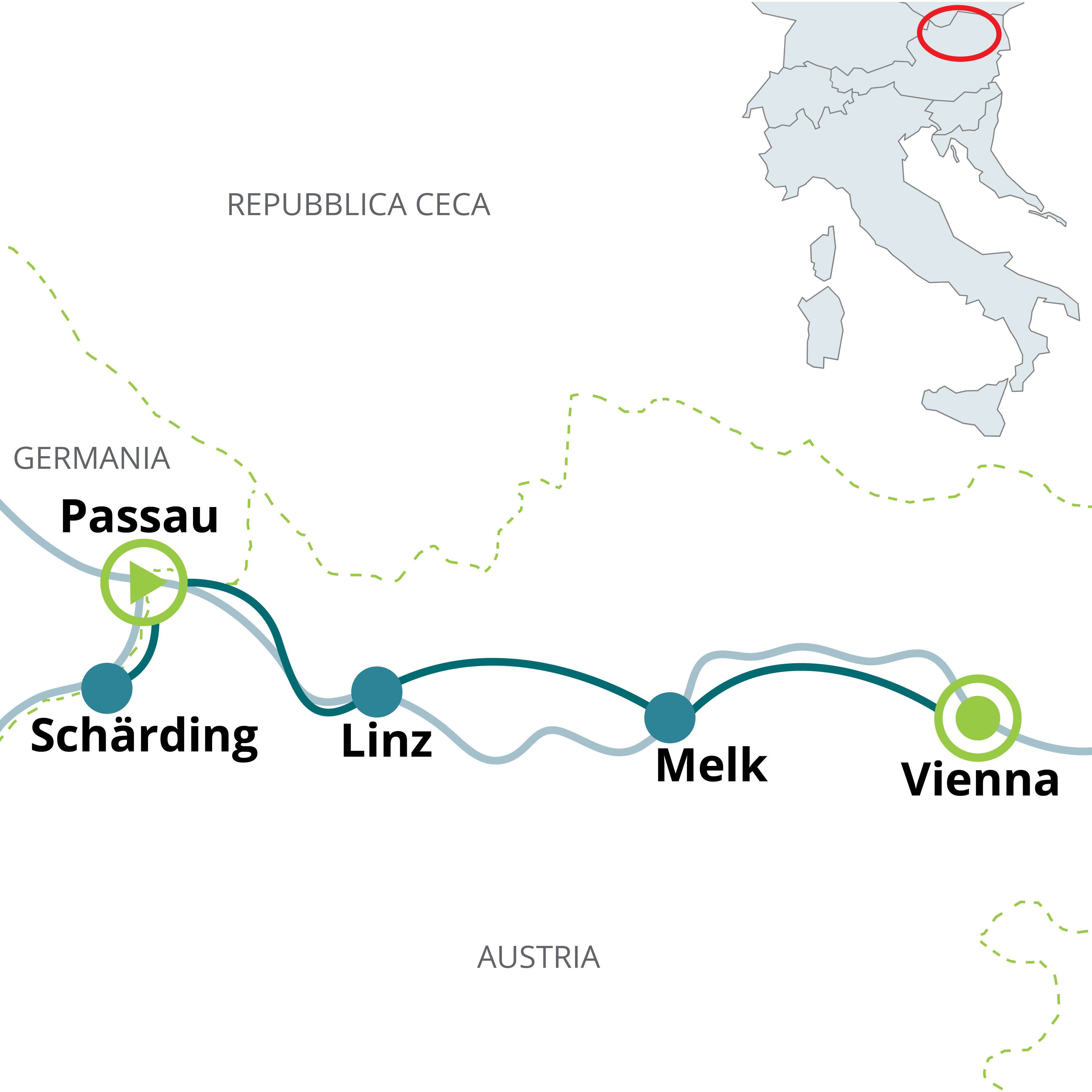 Dopo aver abbandonato Melk, inizia il paesaggio della Wachau, la zona vinicola più famosa d’Austria. In questo affascinante ambiente non può mancare una degustazione di vini che abbiamo organizzato per voi. Tornati in sella attraverserete paesini famosi come Spitz, Weißenkirchen e Dürnstein. Gli ultimi chilometri condurranno a Krems, città famosa per i suoi vini, alla città romana di Tulln, fino alla metropoli del Danubio: Vienna, la vivace capitale dell’Austria ed antica residenza imperiale.