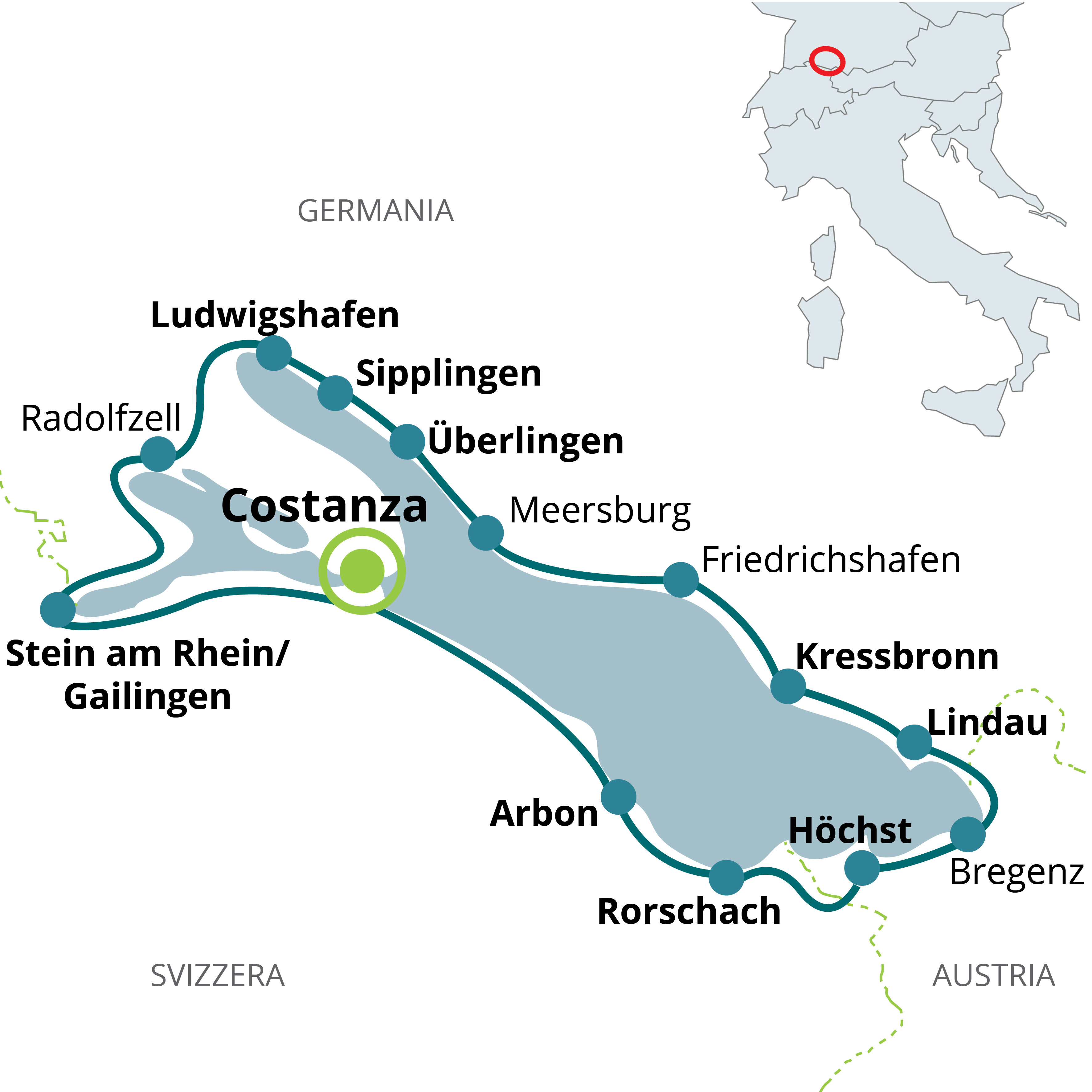 seguendo le comode piste ciclabili che circondano il lago attraverserete rigogliosi vigneti, affascinanti cittadine, colorati giardini fioriti, parchi naturali, un paesaggio meraviglioso ricco di cultura e storia. Vi aspetta un itinerario classico che vi porterà a percorrere in 7 giorni tutto il perimetro del lago mostrandovene i luoghi principali: Costanza, Stein am Rhein, Meersburg , Lindau e la città del festival di Bregenz.