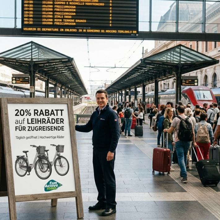 Manchmal ist es jedoch umständlich, das eigene Rad im Zug mitzunehmen. Vor allem in stark frequentierten Zügen oder auf Strecken, bei denen die Fahrradplätze begrenzt sind, gibt es immer wieder Engpässe. Wer schon einmal mit vollgepackten Taschen am Bahnsteig stand und gehofft hat, dass noch ein Stellplatz frei ist, kennt diese Unsicherheit. Genau deshalb machen wir es dir leichter: Alle Gäste, die mit dem Zug anreisen, erhalten 20 % Rabatt auf unsere hochwertigen Leihräder. So reist du entspannt und ein perfekt gewarteten Bikes wartet bereits auf dich vor Ort.