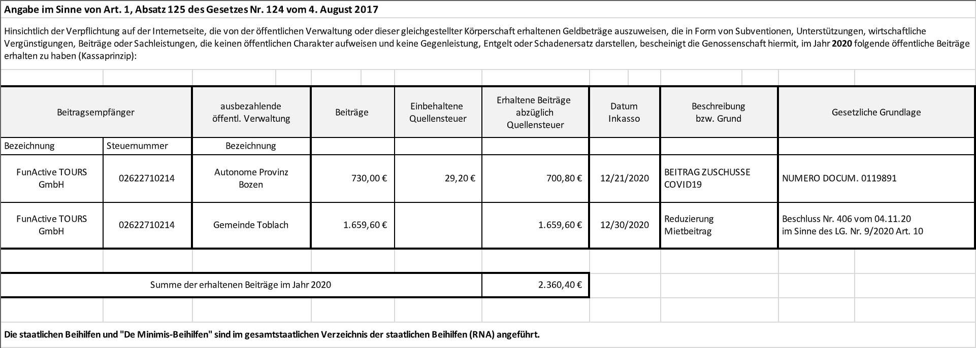 Hiermit wird bekannt gegeben, dass im Jahr 2022 Beträge von der öffentlichen Verwaltung in Form von Unterstützungen, Subventionen, Vergünstigungen, Sachleistungen oder Beiträgen erhalten wurden.