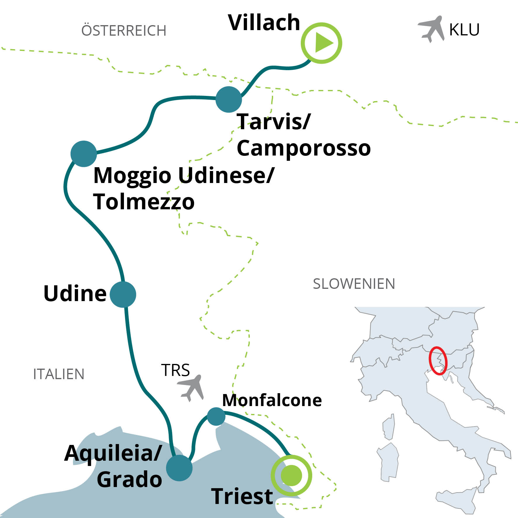 Ausgangspunkt dieser Radreise ist Villach, am Rand des Klagenfurter Beckens gelegen, wo die Flüsse Drau und Gail zusammenfließen. Bald schon heißt es jedoch wieder Abschied nehmen von Österreich, bevor die Radreise in Italien ihre Fortsetzung findet. Die Region Friaul-Julisch Venetien bietet nicht nur landschaftliche Abwechslung, sondern lädt Sie zudem auf einen Streifzug durch die kulturelle Vielfalt der Region ein. Dieser Mix der Kulturen spiegelt sich auch in der Küche wieder: alpenländisch-österreichische, slowenische und venezianische Einflüsse prägen das gastronomische Angebot der Region. Die Gipfel der Karnischen Alpen weit hinter sich lassend, radeln Sie auf der Südseite der Alpen dem Meer entgegen und vor Ihnen erstreckt sich die Küste der Adria mit kilometerlangen Sandstränden. All jene die nach Triest, der ehemaligen Habsburgerstadt weiterradeln gönnen sich einen „Faulenzertag“ in Grado, einem den beliebtesten Badeorten Italiens.