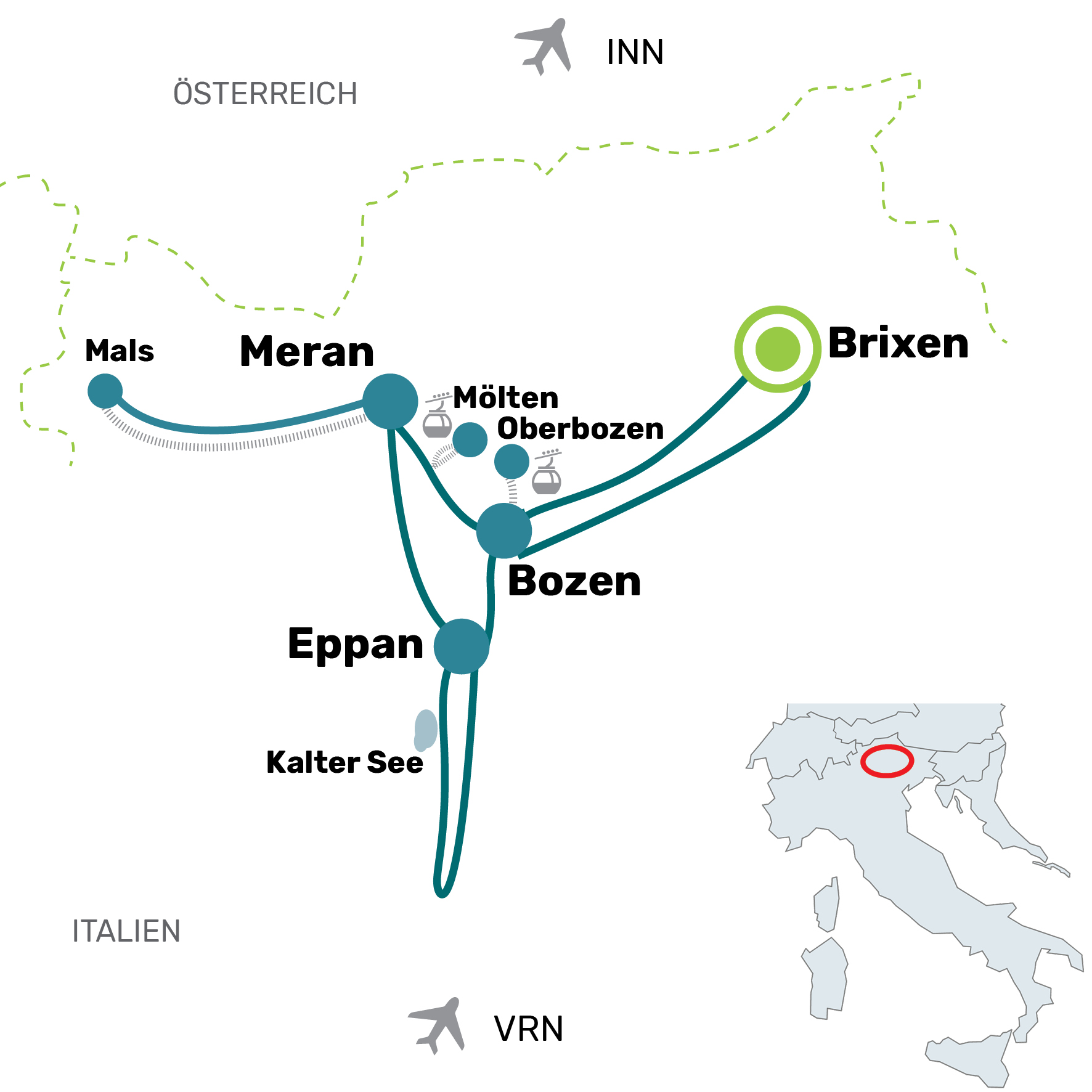 Mit dem Flugzeug: Die nächsten Flughäfen sind Innsbruck (ca. 83 km), Verona Villafranca (ca. 191 km), Treviso (ca. 228 km), Venedig Marco Polo (ca. 313 km).