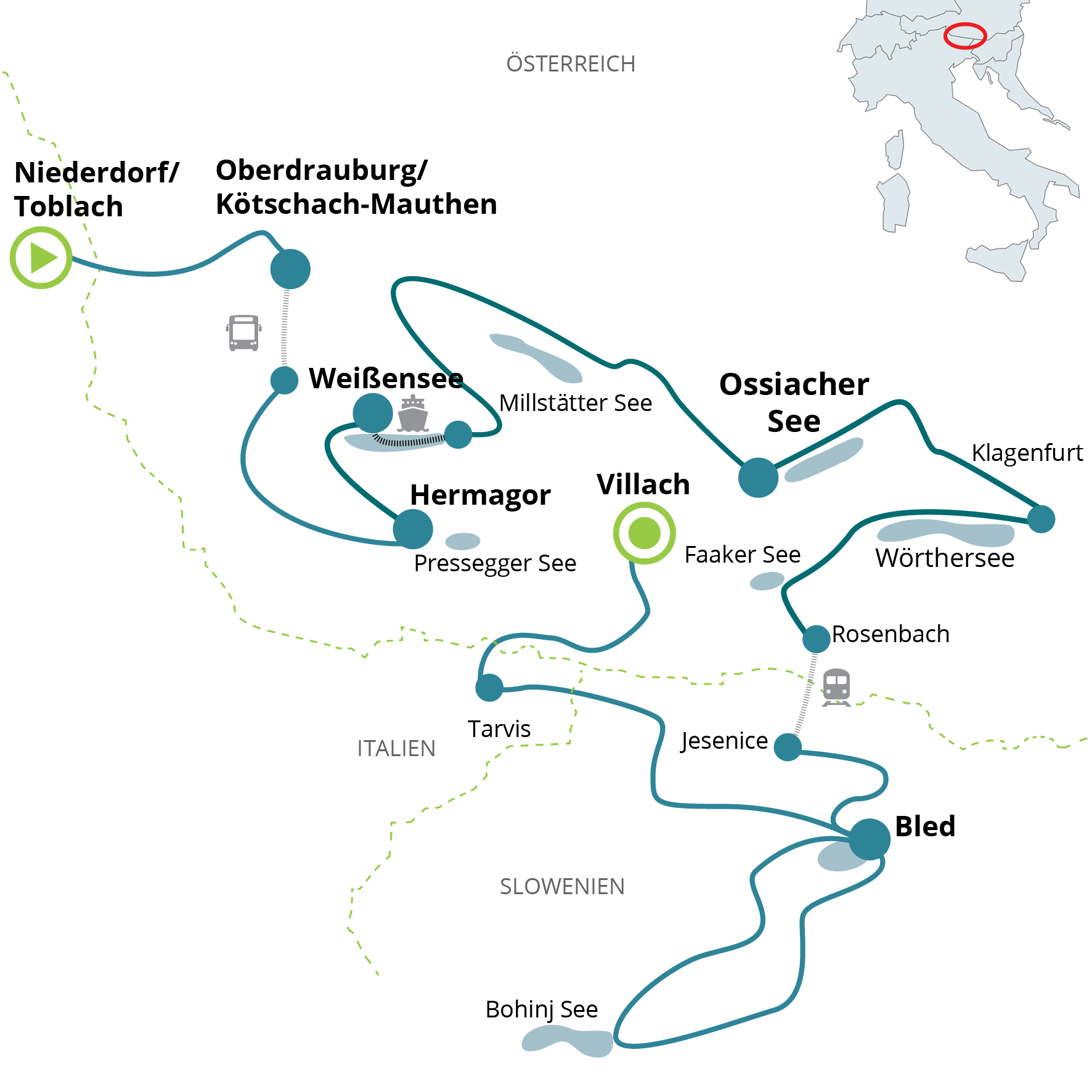 Diese Tour führt Sie zu den schönsten Seen Kärntens. Vorbei an blauen und türkisen Seen, begleitet von einer Hügel- und Berglandschaft besticht die Route durch eine abwechslungsreiche Landschaft. Der mediterrane Einfluss im Süden Österreichs macht Radfahren von April bis Oktober zum Genuss. Die Radreise führt Sie, ausgehend von Villach, der Rad-Hauptstadt Kärntens zum Millstätter See und Weißensee, weiter über den Gailtalradweg vorbei am Faaker See zum smaraldgrünen Wörthersee und endlich zum Ossiacher See und wieder zurück nach Villach.