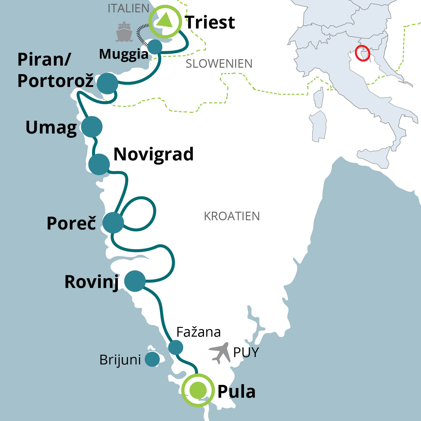 Ausgangspunkt dieser Radreise ist Triest, die ehemalige Habsburger Hafenstadt, an den Ausläufern des Karsts gelegen. Zur Zeit des Römischen Reiches entwickelte sich Triest von einer relativ kleinen, unbedeutenden Stadt in eine betriebsame und reiche Hafenstadt. Nach wenigen Kilometern verlassen Sie Italien und radeln nach Slowenien und Kroatien. Diese sonnige Halbinsel im Mittelmeer wird vor allem geprägt durch malerische kleine Fischerdörfer, kleinen Städtchen auf den karstigen Hügeln, Weinberge und Täler. Lassen Sie sich vom Charme der kontrastreichen Landschaften und den vielen Farben Istriens überraschen.