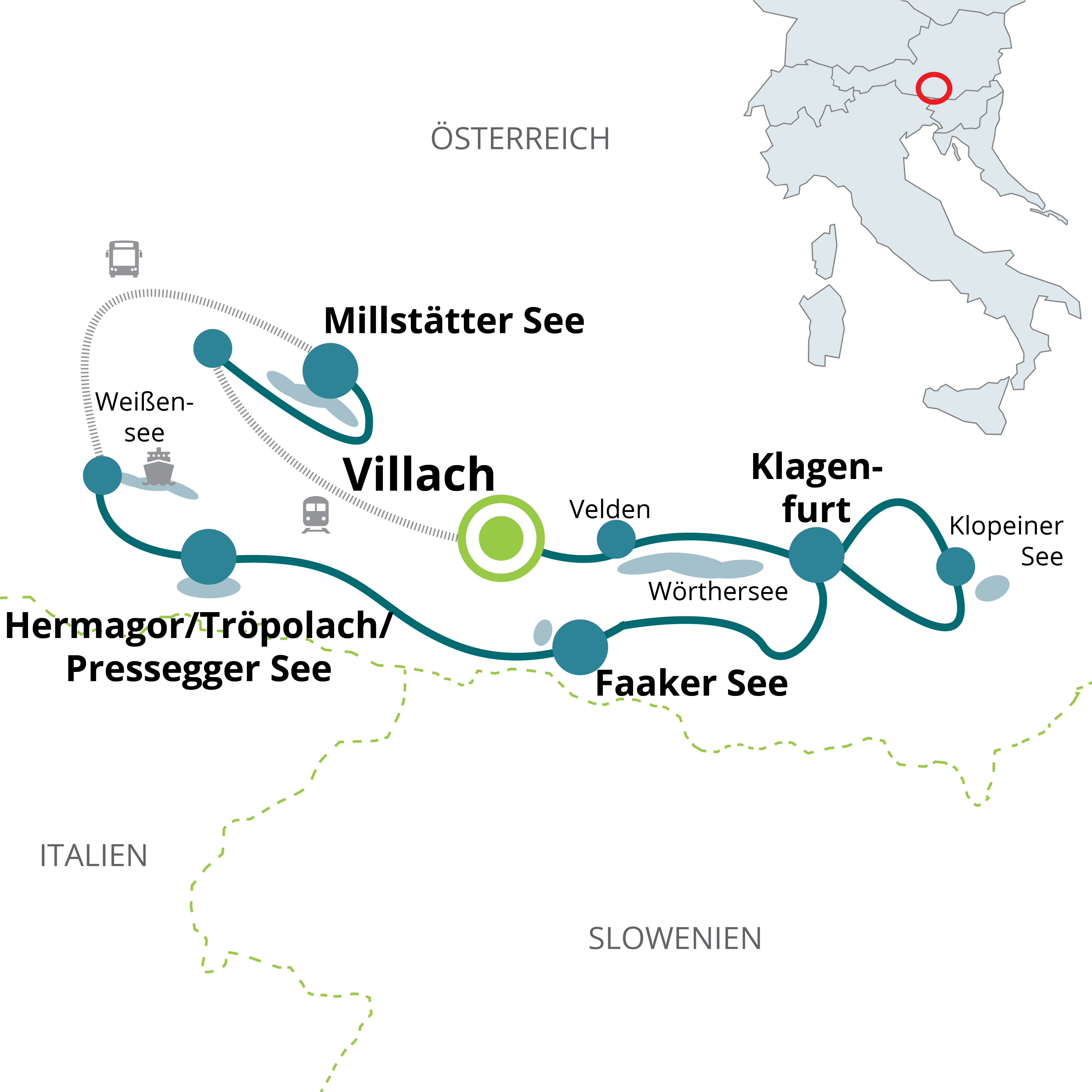 Die Kärnten Seen Schleife Genusstour ist eine Radtour zu den schönsten Seen Kärntens. Sie folgt der originalen Großen Seen-Schleife, herausfordernde Passagen werden im Rahmen der Genusstour durch Transfers (Zug und Auto)