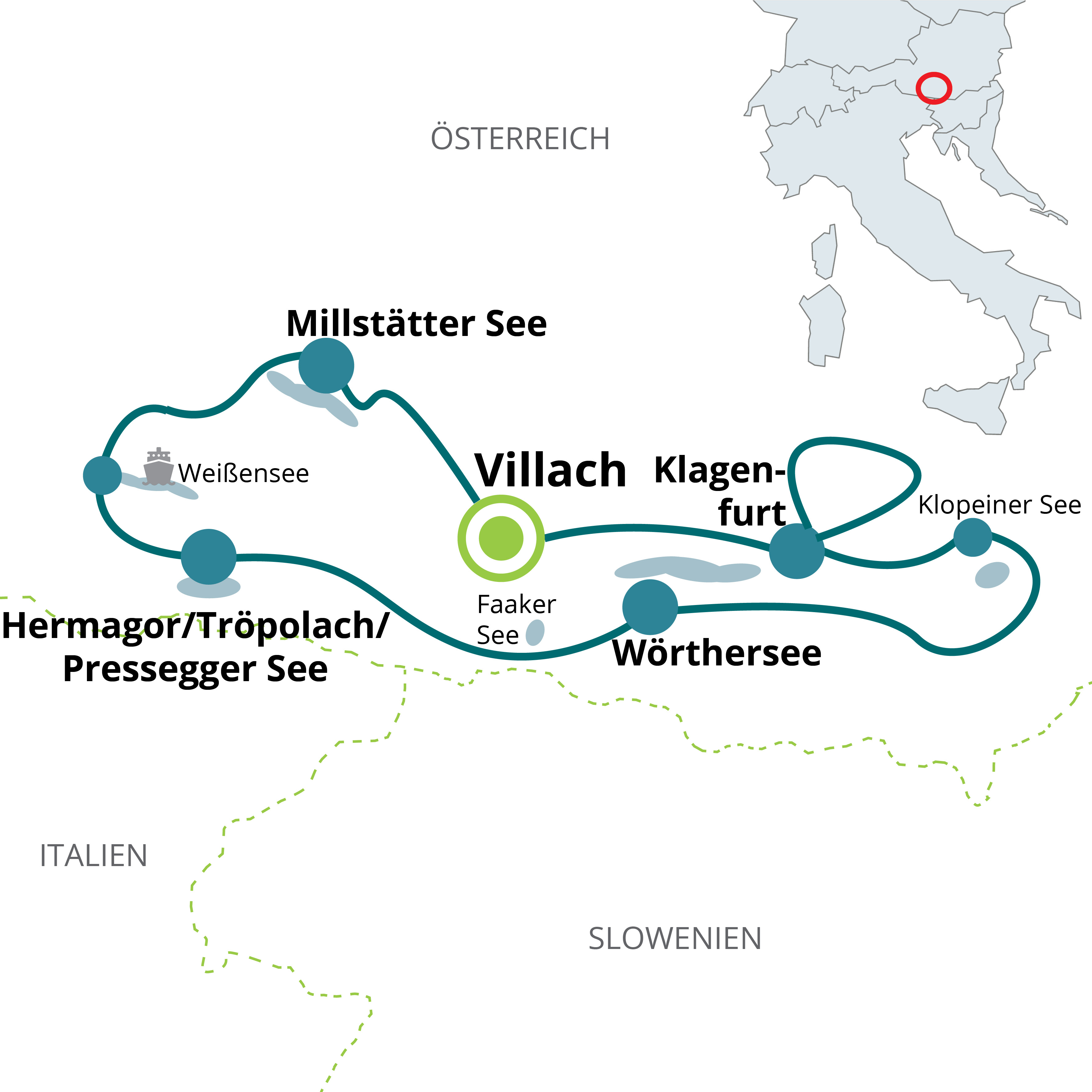 Die Kärnten Seen Schleife ist eine 400 km lange Radtour zu den schönsten Seen Kärntens. Vorbei an blauen und türkisen Seen, begleitet von einer Hügel- und Berglandschaft besticht die Route durch eine abwechslungsreiche Landschaft. Der mediterrane Einfluss im Süden Österreichs macht Radfahren von April bis Oktober zum Genuss. . Die sportive bzw. e-bike Tour ist eine Radreise für sportliche ambitioniertere und geübtere Radfahrer, es ist die eine oder andere Steigung zu überwinden und die Strecke führt abschnittsweise auch mehrere Kilometer an stärker befahrenen Straßen entlang. Die Radreise führt Sie, ausgehend von Villach, der Rad-Hauptstadt Kärntens zum Ossiacher See, Millstätter See und Weißensee, weiter vom Pressegger See über den Gailtalradweg vorbei am Faaker See zum smaragdgrünen Wörthersee.