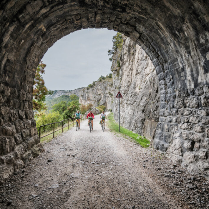 Auf Ihrer heutigen Etappe werden Sie wohl das Herzstück der Parenzana-Bahn erkunden. Durch viele Tunnels und Viadukte, welche gegen Ende des 19. Jahrhunderts erbaut wurden, führt Ihre Reise hinaus aus dem Landesinneren Richtung Adria. Auf Schotterwegen fahren Sie vorbei an landwirtschaftlichen Flächen, Weingärten und roter Erde. Am Endpunkt Ihrer Reise werden Sie jedoch keinen Hinweis auf die Parenzana-Bahn finden. Weder ein Bahnhof noch eine Tafel weisen auf diese wunderschöne Eisenbahnstrecke hin.