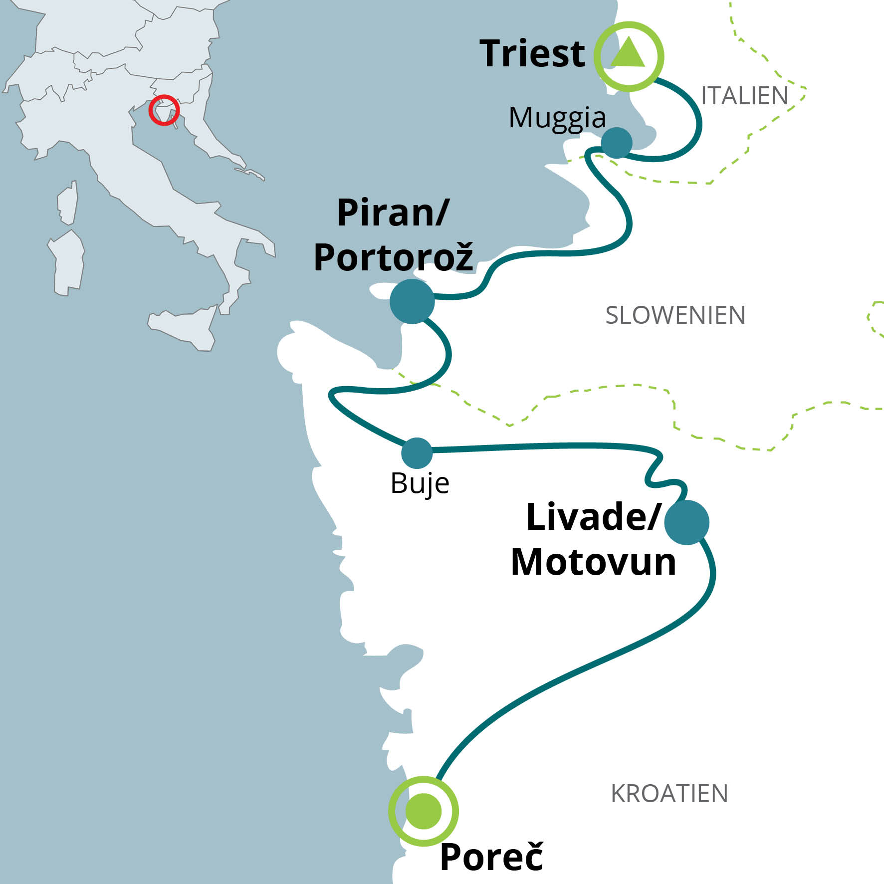 Als Ausgangspunkt Ihrer Radreise liegt Triest sehr günstig. Nach einigen Kilometern verlassen Sie die Hafenstadt und folgen der ehemaligen Trasse Richtung Slowenien. Sie lassen Italien weit zurück und gelangen zum Rosenhafen, auch Portoroz genannt. Doch nicht lange werden Sie auf slowenischem Boden weilen. Schon bald geht es weiter nach Kroatien, ins Land der roten Erde. Die schöne Adria lädt zum Baden ein, und die autofreie Altstadt von Porec empfängt Sie mit offenen Armen.