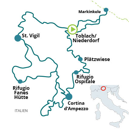 Zum Großteil auf alten Militär- und Forststraßen warten auf jeder einzelnen Etappe große Landschafts- und Natureindrücke der weltberühmten Dolomiten auf Sie. Die Streckenführung verläuft teilweise auf den Spuren des bekannten MTB-Marathons, der alljährlich im Juli stattfindet. Die Dolomiten, UNESCO Weltnaturerbe und bizarre Gipfel säumen Ihren Weg durch die Naturparks „Fanes-Sennes-Prags“, „Ampezzaner Dolomiten“ und „Sextner Dolomiten“.