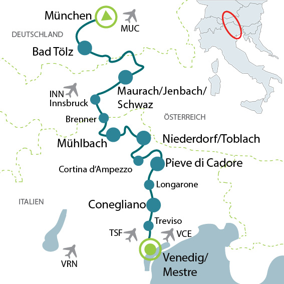 Die Radreise von München nach Venedig ist eine sehr abwechslungsreiche Tour. Den anspruchsvollsten Abschnitt über die Alpen (Innsbruck–Brenner) kann man mit der Bahn oder dem Bus abkürzen und die Strecke durch die Dolomiten von Toblach nach Cortina d’Ampezzo auf dem Radweg entlang der einstigen Bahntrasse ohne Schwierigkeiten radeln. Die letzten zwei Tage geht es bergab und flach dem Meer entgegen. Die Radreise ist für Kinder ab 16 Jahren geeignet.