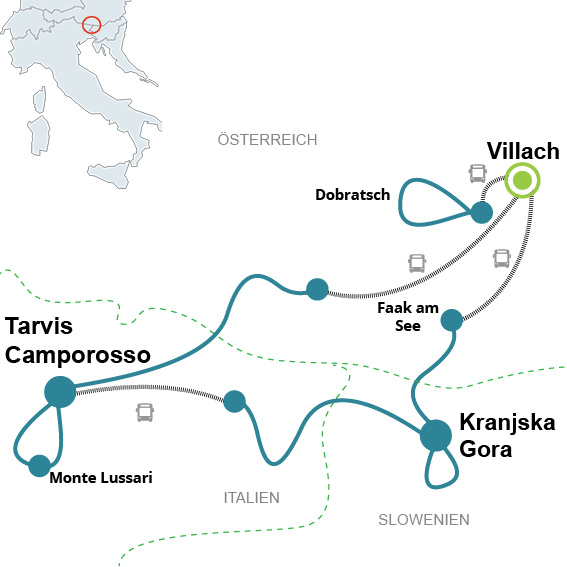 Gestartet wird in Villach. Hier spürt man den nahen Süden. Die Region Friaul-Julisch Venetien ist geprägt durch den Karnischen Höhenkamm von über 100 km Länge, zwischen den Einzugsgebieten von Drau, Gail und Tagliamento, sowie den Julischen Alpen, die noch heute die Grenze zwischen slowenischem und friulanischem Sprachgebiet sind. Ein Höhepunkt der Tour ist sicherlich der italienische Wallfahrtsort Monte Lussari. Der slowenische Teil führt in den Triglav Nationalpark und in den mondänen Skiort Kranjska Gora – auch das Kitzbühel Sloweniens genannt.
