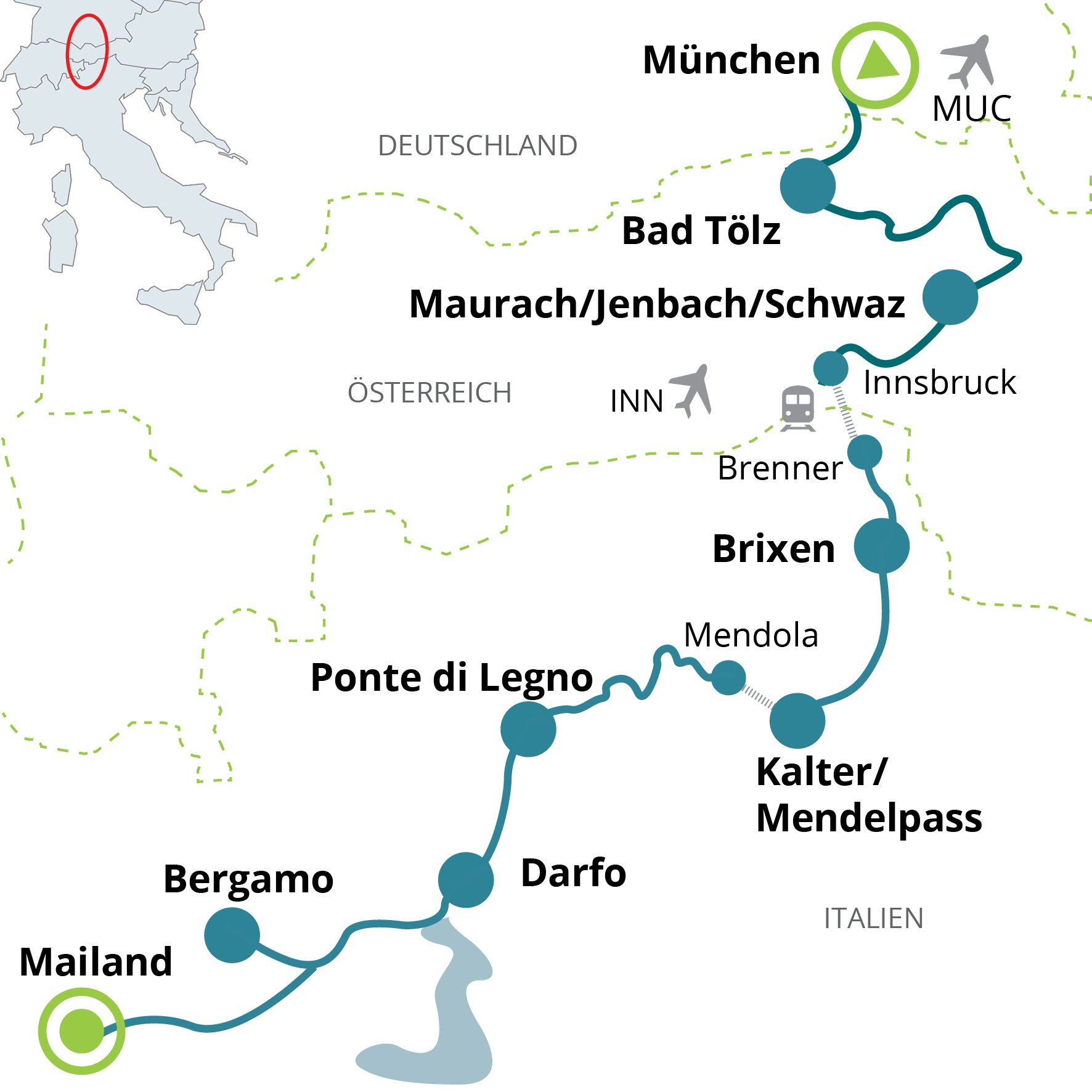 Diese Tour verbindet puren Radgenuss mit dem Erlebnis einer Alpenüberquerung, ausgehend von Deutschland über Österreich bis nach Italien. Auf Radwegen, Radrouten oder kleinen Nebenstraßen erleben aktive Genussradler drei Länder mit ihren Tourismusregionen und vielen herausragenden Natur- und Kulturschönheiten. Die Tour führt ausgehend von der Isarmetropole München, vorbei an den bayrischen Seen und entlang der Flüsse über das Tiroler Inntal, durch das UNESCO Weltnaturerbe, den Dolomiten, nach Mailand.