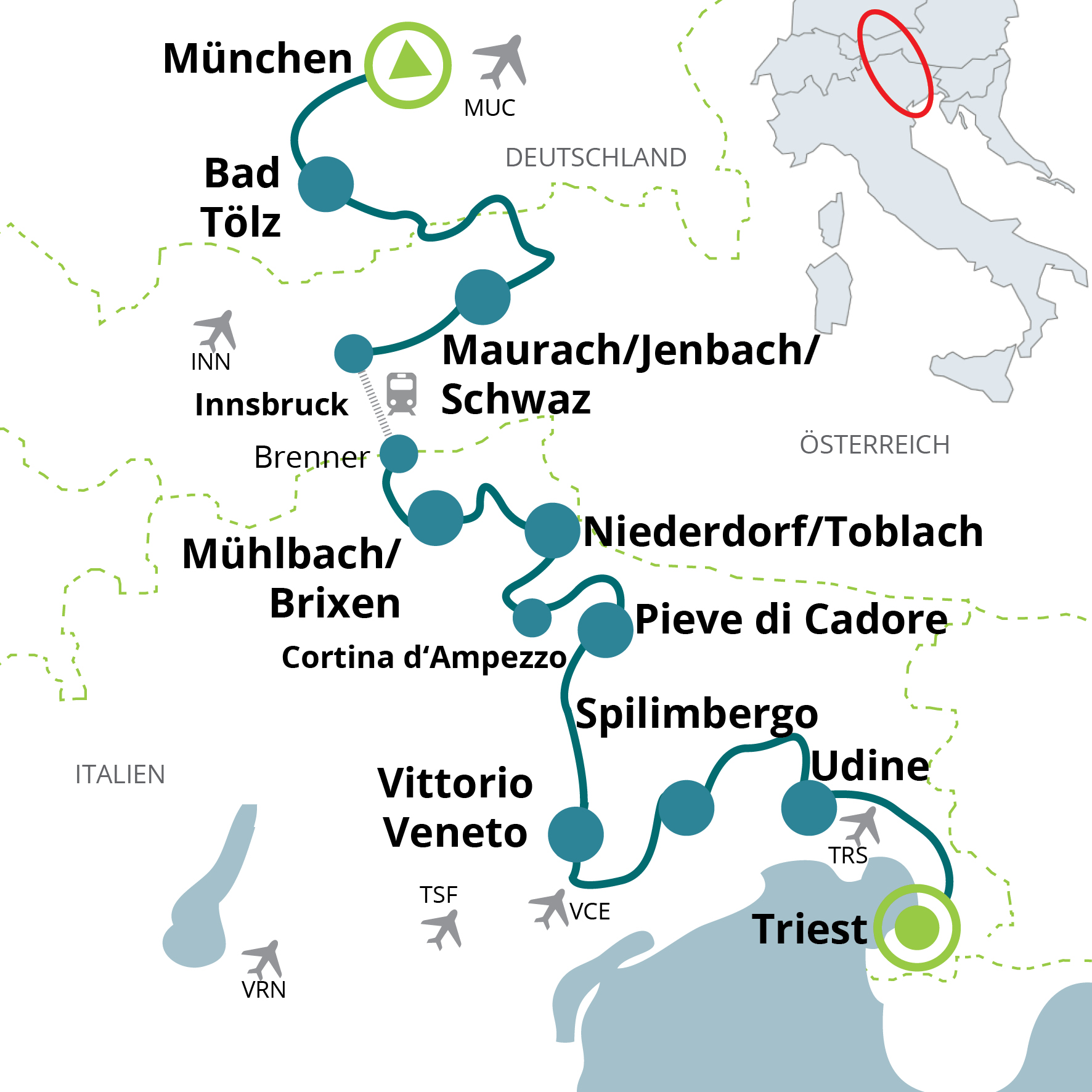 Der Radweg „München–Triest“ verbindet intensiven Radgenuss mit dem unvergesslichen Erlebnis einer Alpenüberquerung von Deutschland über Österreich bis nach Italien ans Adriatische Meer. Auf gut ausgebauten Radwegen, ausgewiesenen Radrouten und ruhigen Nebenstraßen entdecken aktive Genussradler drei Länder mit ihren vielfältigen Tourismusregionen sowie zahlreichen beeindruckenden Natur- und Kulturschätzen. „München–Triest“ führt von der Isarmetropole München vorbei an bayerischen Seen und entlang idyllischer Flussläufe über das Tiroler Inntal, durch alpine Landschaften und weiter nach Friaul-Julisch Venetien, bis Sie schließlich die Hafenstadt Triest mit ihrem einzigartigen Zusammenspiel aus Meer, Geschichte und mitteleuropäischem Flair erreichen.