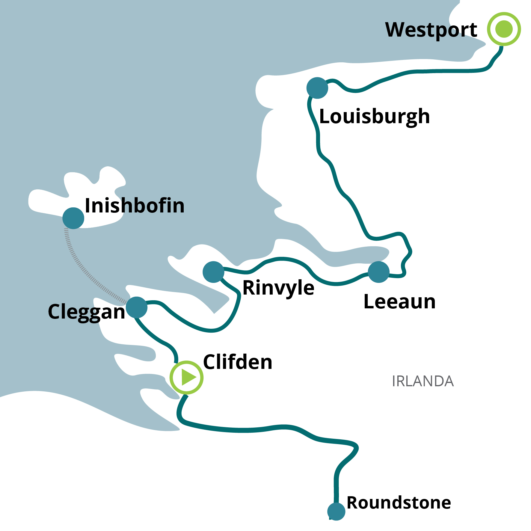 Die heutige Strecke von der Halbinsel Renvyle folgt einer gewundenen Küstenstraße entlang des Atlantiks, vorbei an weißen Sandstränden und durch das malerische Dorf Tullycross mit seinen traditionellen strohgedeckten Häusern.