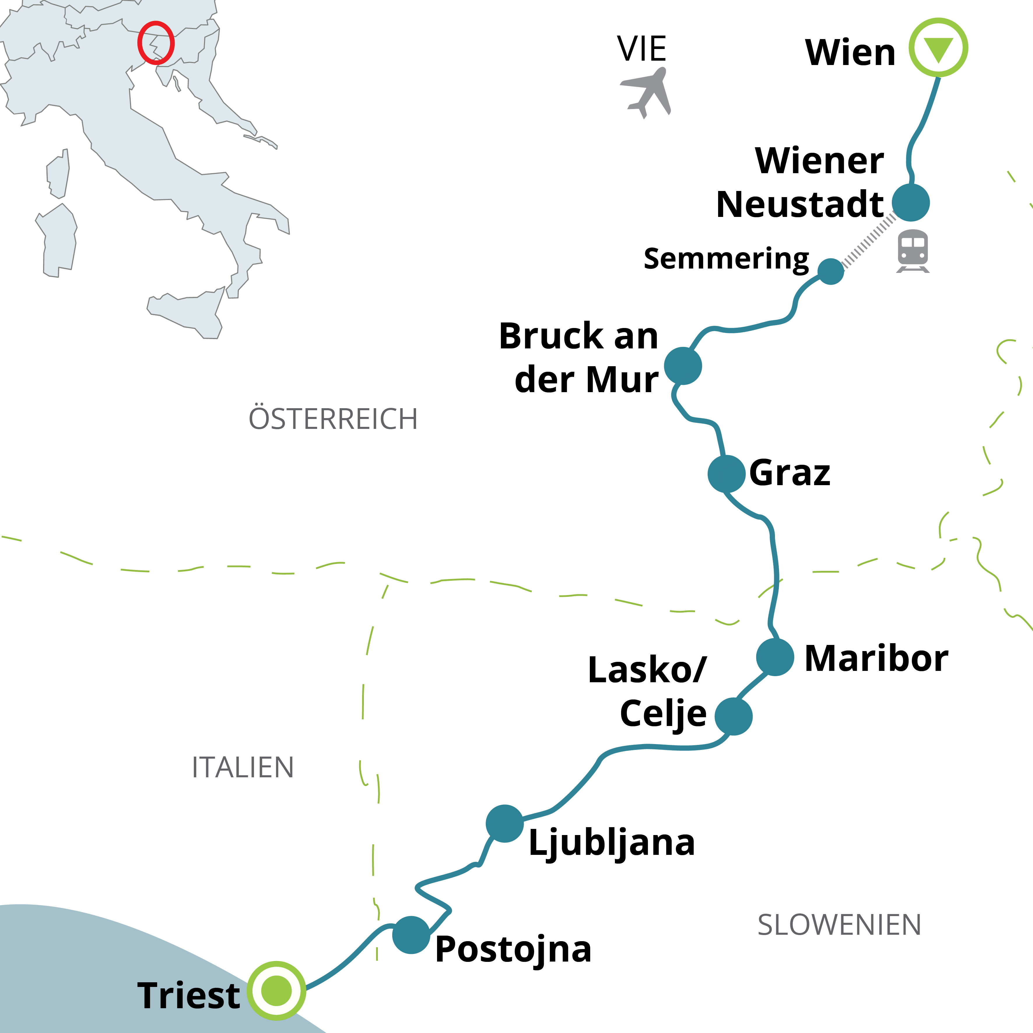 Die Radreise von Wien nach Triest verbindet 5 Städte, die durch ihre große gemeinsame Geschichte eng miteinander verbunden sind. Als ehemalige Teile der Habsburgermonarchie teilen Wien, Graz, Maribor, Ljubljana und Triest ein reiches kulturelles Erbe, das auf dieser Route lebendig wird. Entdecken Sie die kaiserliche Pracht Wiens und die abwechslungsreichen Landschaften Österreichs. Erleben Sie das grüne, unberührte Slowenien, das als Brücke zwischen Mitteleuropa und dem Mittelmeer fungiert. Atmen Sie mediterrane Luft ein und genießen Sie den Mittelmeer-Flair in Italiens Küstenstadt Triest, einst wichtigster Hafen der Habsburger Monarchie. Sie werden nicht nur die Geschichte, auch die gemeinsame Kultur und Lebensart hautnah am Rad kennenlernen. Jede Landschaft, jede Region und jede Stadt ist Teil dieses Lebensgefühls und trägt zu einem harmonischen Gesamtbild der reichen gemeinsamen Vergangenheit bei, die bei jedem Pedaltritt spürbar ist.