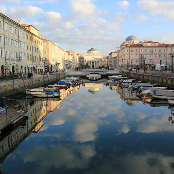 Von weitem schon streift Ihnen eine sanfte Meeresbrise über das Gesicht und kündigt die Nähe zur Adria an. Das Hinterland wird vom Karst durchzogen, eine Felsregion aus weißen, zerklüfteten Kalkfelsen mit zahlreichen Höhlen, die der Landschaft ein bizarres Aussehen verleihen. Dort, wo die Karsthochebene in das tiefblaue Wasser eintaucht, und die weißen Steilhänge senkrecht über dem Meer gen Himmel ragen, folgen Sie der Küstenstraße durch suggestive Orte wie Duino, Sistiana, Miramare und Barcola. Über dem Golf von Triest erhebt sich die gleichnamige Stadt, einst Hafenmetropole des Habsburger Reiches, wo Sie den heutigen Abend verbringen.