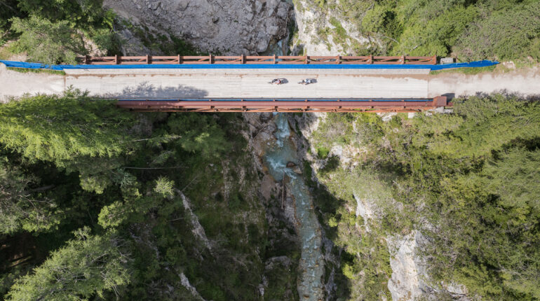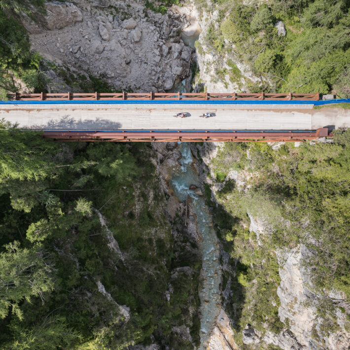 Die letzte Etappe startet in Cortina mit einer Liftfahrt zum Rifugio Faloria, bevor es auf dem Rad hinunter zum Rio Gere geht. Über den Lift erreicht man das Rifugio Son Forca, von wo aus die Strecke durch das idyllische Tal nach Ospitale führt. Auf dem Radweg zurück nach Toblach lassen sich die sanften Hügel und klaren Bergseen der Region genießen, während die Landschaft langsam in die Weite des Pustertals übergeht. Ein würdiger Abschluss der Tour, der noch einmal die Vielfalt der Dolomiten in all ihren Facetten zeigt.