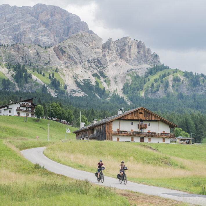 Sie radeln entlang der farbigen Felswände von Rosengarten und Schlern, durch die imposanten Bergmassive von Sella und Puez–Odle, über die stillen Hochflächen von Fanes–Sennes–Prags und durch die weitläufigen Täler des Val di Fassa und Val di Fiemme.