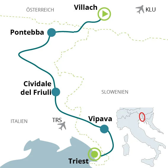 Ausgangspunkt dieser Gravel-Tour ist Villach, am Rand des Klagenfurter Beckens gelegen, wo die Flüsse Drau und Gail zusammenfließen. Bald schon heißt es jedoch wieder Abschied nehmen von Österreich, bevor die Radreise in Italien ihre Fortsetzung findet. Die Region Friaul-Julisch Venetien bietet nicht nur landschaftliche Abwechslung, sondern lädt Sie zudem auf einen Streifzug durch die kulturelle Vielfalt der Region ein. Dieser Mix der Kulturen spiegelt sich auch in der Küche wieder: alpenländisch-österreichische, slowenische und venezianische Einflüsse prägen das gastronomische Angebot der Region. Die Gipfel der Karnischen Alpen weit hinter sich lassend, radeln Sie auf der Südseite der Alpen dem Meer entgegen und vor Ihnen erstreckt sich die Küste der Adria mit kilometerlangen Sandstränden.