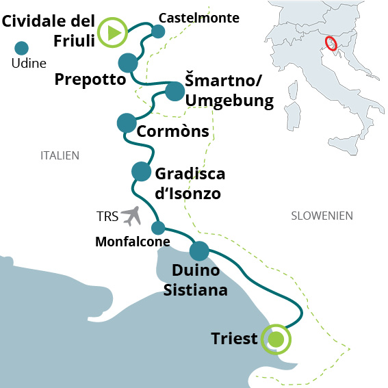 Ausgangspunkt dieser Wanderreise ist Cividale del Friuli. Der Weitwanderweg Alpe-Adria-Trail verläuft beginnend in Kärnten über Slowenien nach Friaul-Julisch Venetien und ist somit auch Treffpunkt dreier Kulturen. Kulturell und landschaftlich hat der Alpe-Adria-Trail viel zu bieten: angefangen beim Wallfahrtsort Castelmonte über Cormons, Karst und Brda bis zum Etappenziel in der ehemaligen Habsburgerstadt Triest.