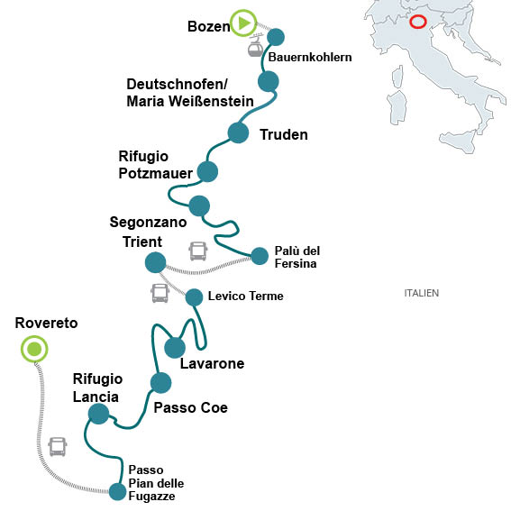 Auf Ihrer letzten Etappe werden Sie das geschichtsträchtige Passubio-Massiv überschreiten. Die Wanderung führt Sie über Steige über den Dente Austriaco (österreichische Platte) zum Dente Italiano, wo sich die Österreicher und Italiener zwischen 1916 bis 1918 bekämpft haben. Vom Etappenziel beim Passo Pian delle Fugazze fahren Sie mit dem Bus nach Rovereto.