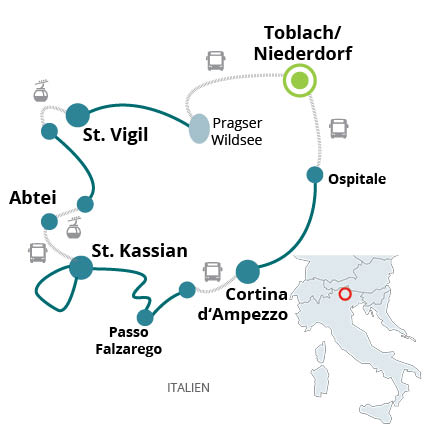 über die Brennerautobahn (A22) nach Brixen – Ausfahrt Franzensfeste, Pustertal - durch das Pustertal (Staatsstraße SS49) nach Niederdorf oder Toblach, je nach Anreisehotel oder über die Felbertauernstraße nach Lienz in Osttirol und weiter nach Italien in das Hochpustertal (Niederdorf bzw. Toblach, je nach Anreisehotel).