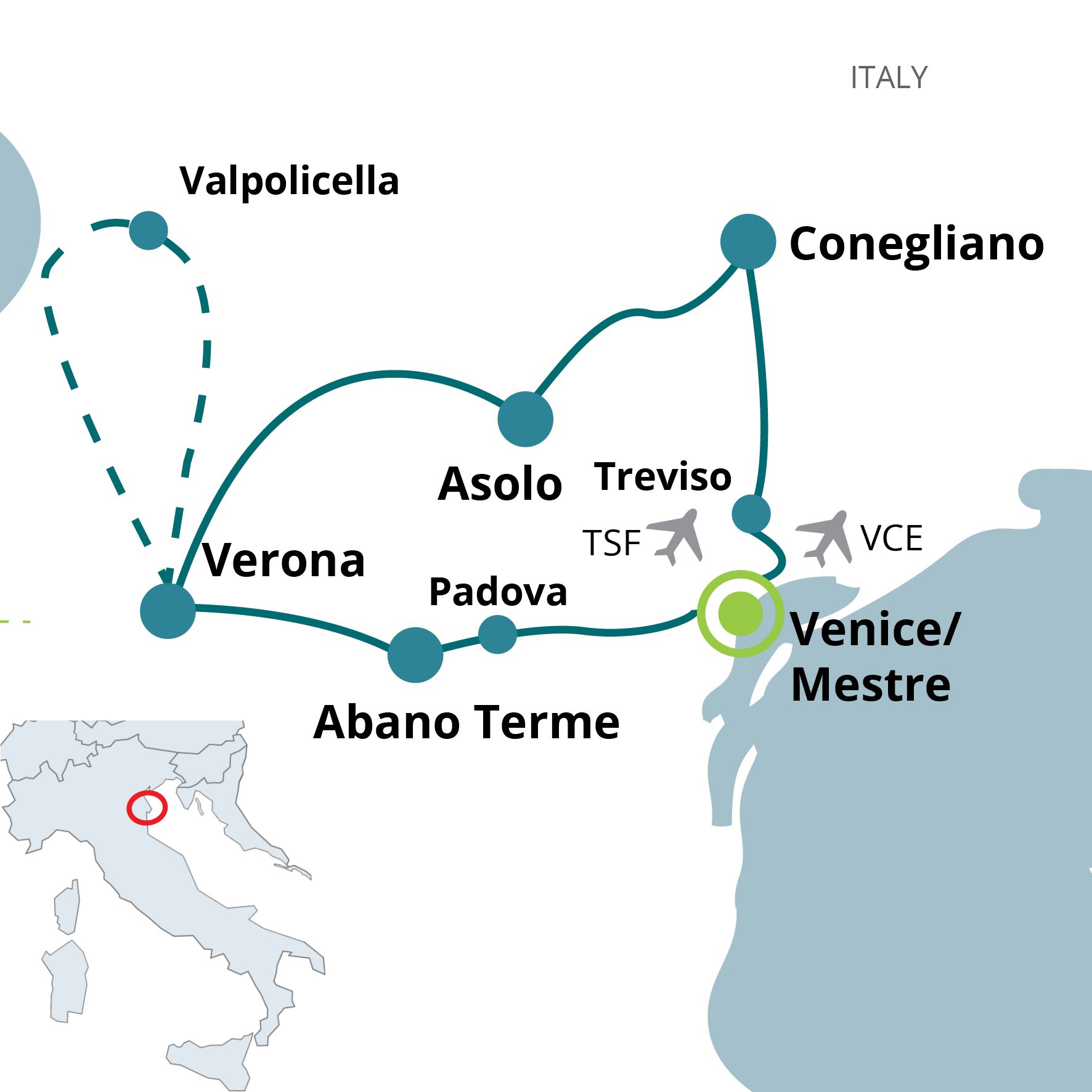 During this round trip through through Veneto, you will discover everything that makes this region famous, exploring its landscape, traditions, and culture. This circular tour takes you from the Venice lagoon through some of the region’s most well-known cities: Abano Terme, Verona, and Conegliano. Besides nature and culture, you will immerse yourself in the tradition of viticulture and winemaking that characterize this rich region, thanks to a stop in Valpolicella, renowned for producing its namesake wine.