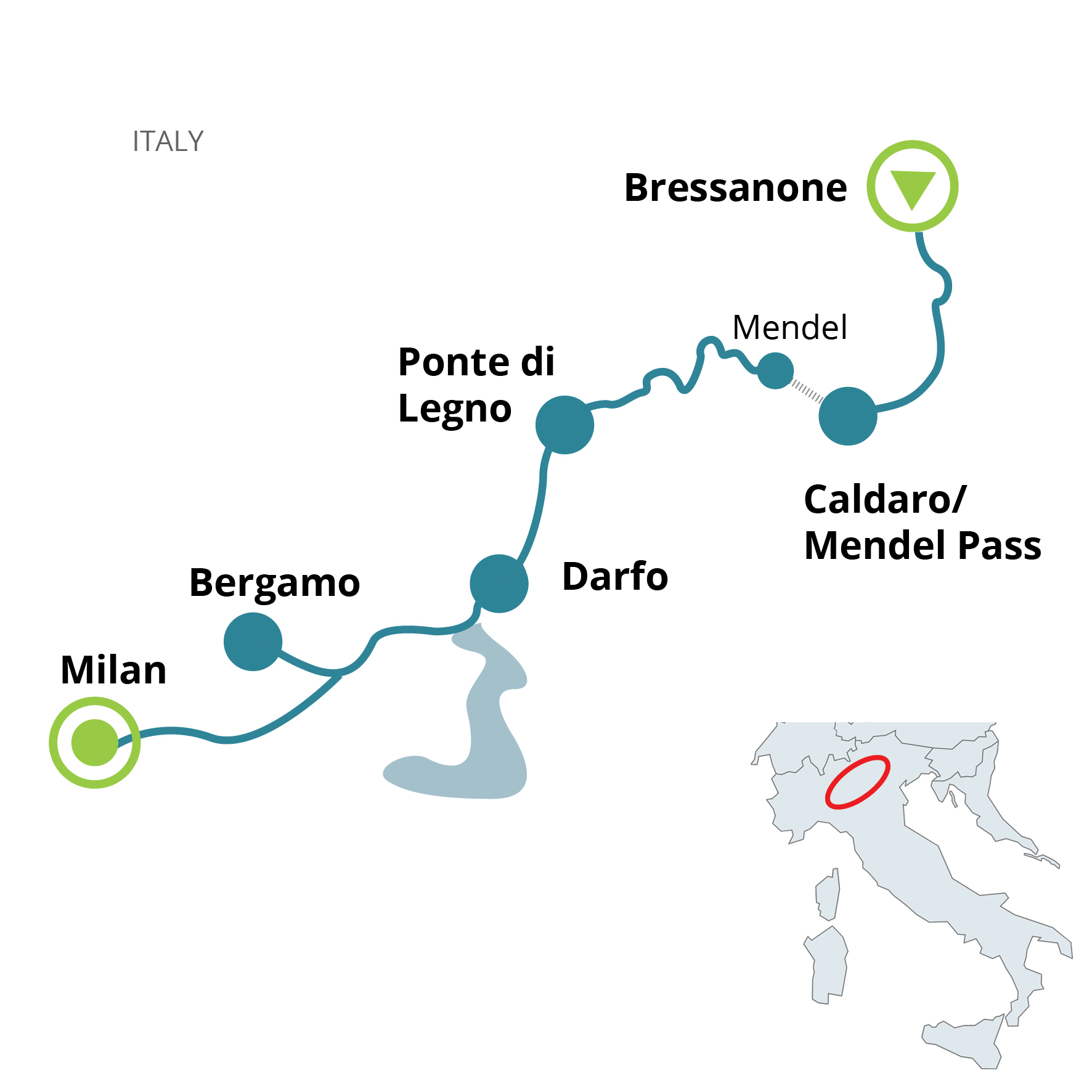 From Darfo Boario Terme, you ride toward the enchanting shores of Lake Iseo, where the calm, shimmering waters meet the surrounding mountains in a breathtaking panorama. The journey continues through the rolling hills of Franciacorta, a land celebrated for its prestigious vineyards and world-famous sparkling wines. Your arrival in Bergamo is crowned by the ascent to the historic Città Alta, with its centuries-old walls and winding medieval streets—bringing to a close a stage rich in natural beauty, cultural heritage, and timeless traditions.