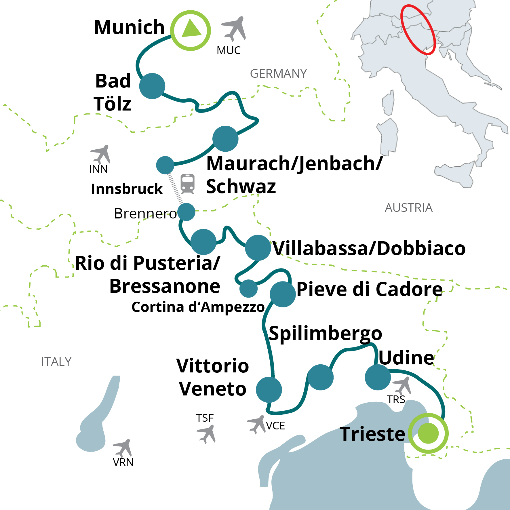 The “Munich–Trieste” cycle route combines intense cycling enjoyment with the unforgettable experience of crossing the Alps from Germany via Austria to Italy and on to the Adriatic Sea. Following well-developed cycle paths, signposted cycling routes, and quiet side roads, active leisure cyclists discover three countries with their diverse tourism regions, as well as numerous impressive natural and cultural highlights.The “Munich–Trieste” route leads from the Isar metropolis of Munich past Bavarian lakes and along idyllic river courses, through the Tyrolean Inn Valley and alpine landscapes, and onward to Friuli–Venezia Giulia, until you finally reach the port city of Trieste, with its unique blend of sea, history, and Central European flair.