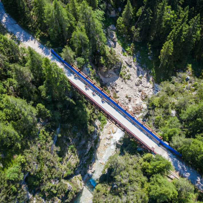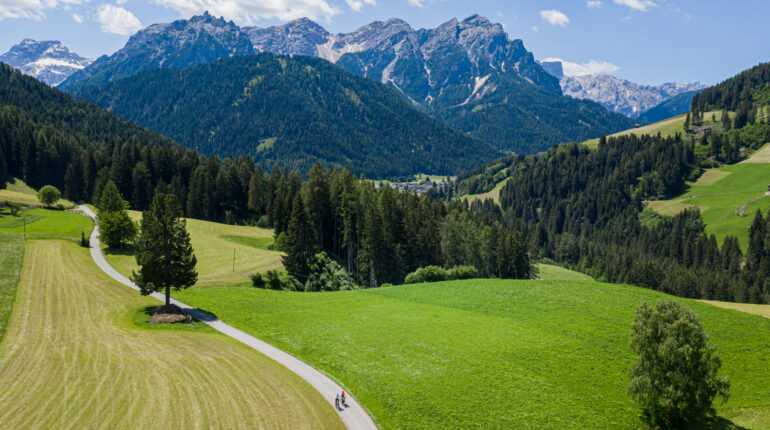 The more challenging variant first takes you into the Braies Valley. Here you can make a detour to the idyllic Lago di Braies Lake. The stage takes you to the high plateau of Prato Piazza, with the Dürrenstein and the Hohe Gaisl towering majestically above. The route then descends along the old military road into the Höhlenstein Valley and along the old railway line „Ferrovia delle Dolomiti“ over the Cimabanche Pass to the Olympic town of Cortina d‘Ampezzo.