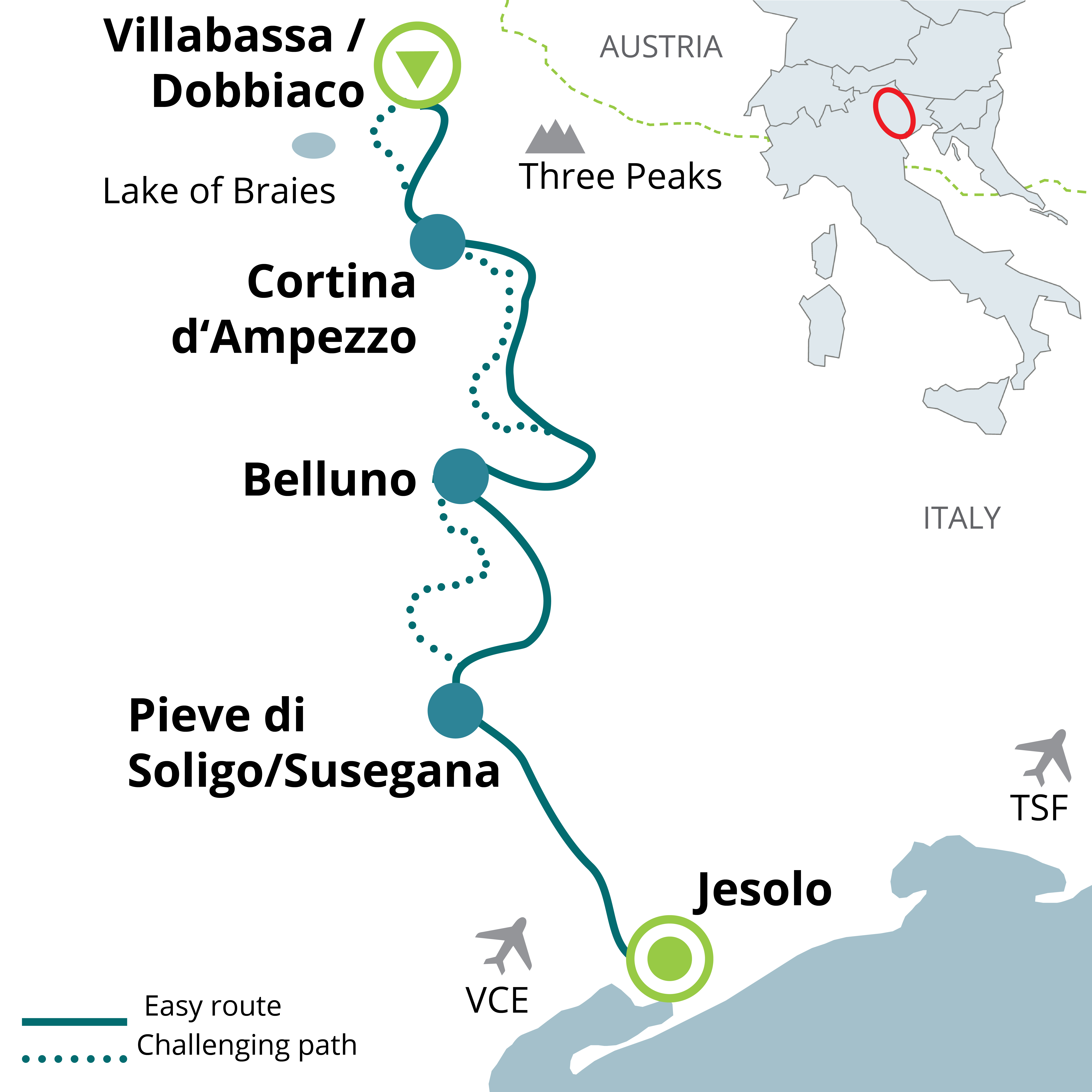By plane: Low cost flights are available to Treviso and Venice. We can organise transfers from the airport to the starting point of the cycle tour on request.