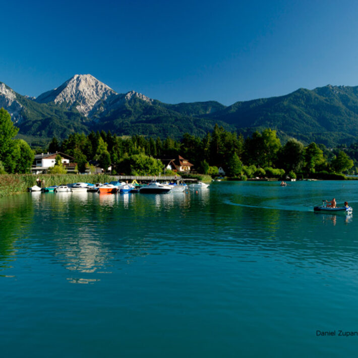 Lake Faak is the southernmost bathing lake in Austria and a true natural beauty. The water of Lake Faak shimmers turquoise blue and on the horizon the mountain ranges of the Karawanken mountains rise into the sky.