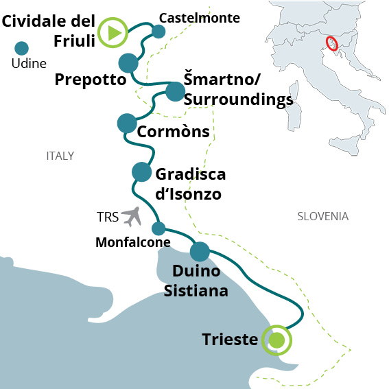 Starting point of this hiking holiday is Cividale del Friuli. The long-distance hiking path Alpe Adria Trail starts in Carinthia and runs through Slovenia to Friuli-Venezia Giulia; therefore it is a meeting point of three cultures. The tour offers both culturally and naturally enormous variety: starting with the place of pilgrimage of Castelmonte, through Cormons, Karst and Brda to the end of this stage in Trieste, a former Habsburg city.