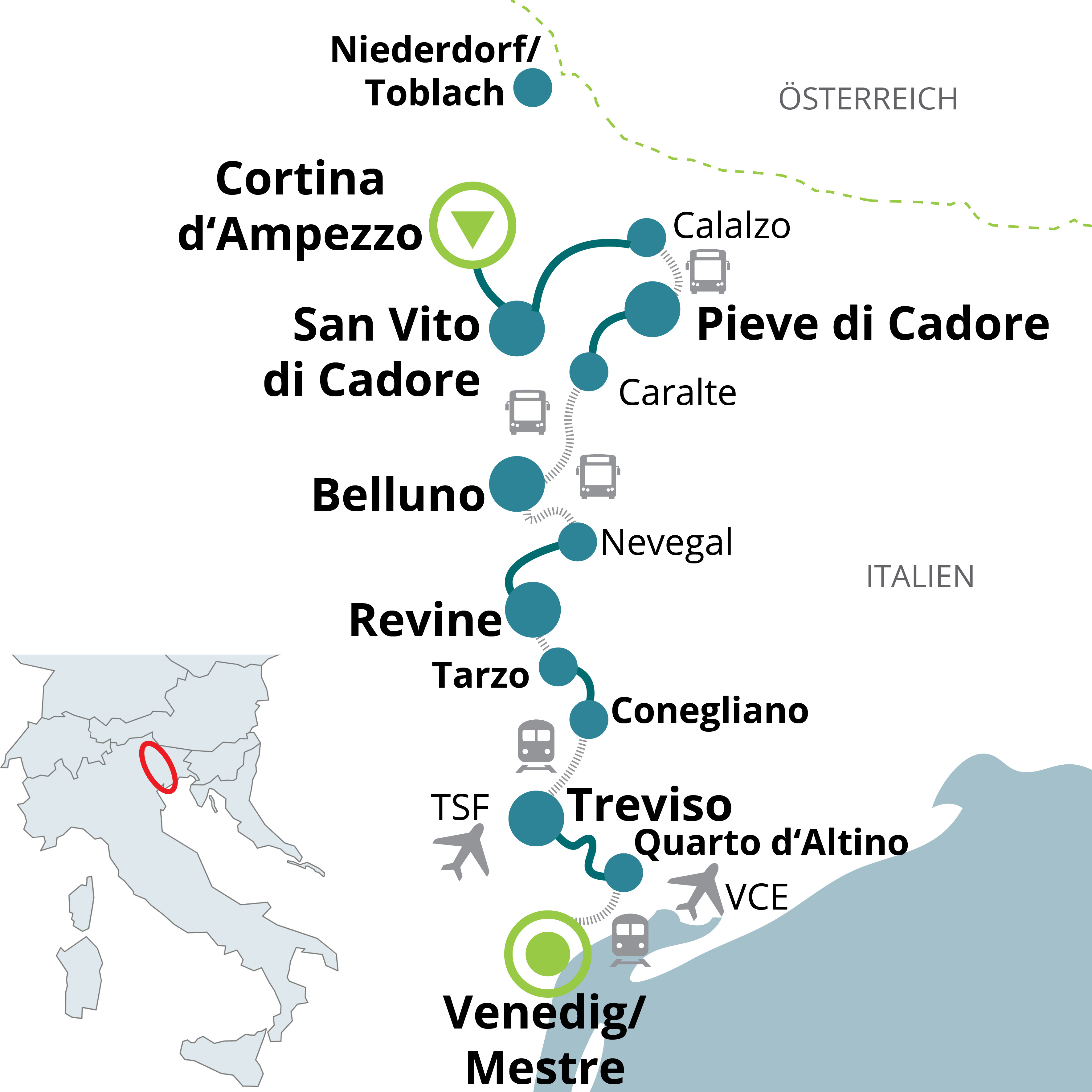 Every Saturday, shuttle bus transfer from Venice/Mestre to Dobbiaco/Villabassa at a price of €79.00 per person (reservation and payment required at the time of booking). Alternative: the bus Cortina Express offers daily rides from Venice/Mestre to Cortina d‘Ampezzo (reservation at www.cortinaexpress.it).