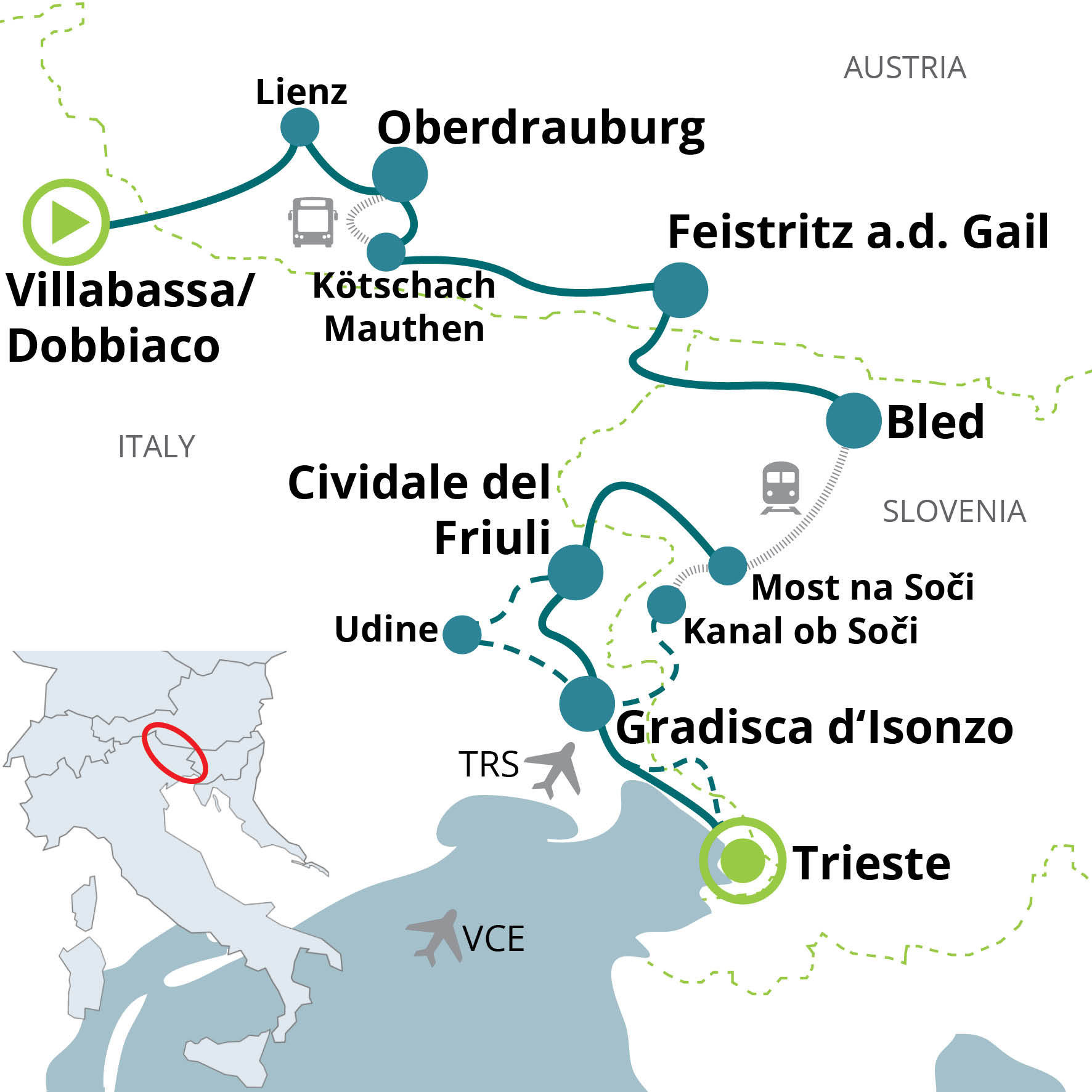 Starting from the northeastern Dolomites, the first part of the route runs along the river Drau through the valley of the same name and then on through the Gailtal valley on leisurely cycle paths. After a short detour to the Italian border town of Tarvisio you cycle on to Slovenia. At the fairy-tale Lake Bled, you will be at the foot of the Julian Alps. After a transfer to the south side of the Alps, you will return to Italy in the region of Friuli-Venezia Giulia and in the famous wine region “Collio”. The former capital of the Lombards, Cividale del Friuli, is worth a visit. Afterwards, a spectacular end to the cycle tour on the Adriatic awaits you. On the last day you cycle along the sea to the former Habsburg port of Trieste.