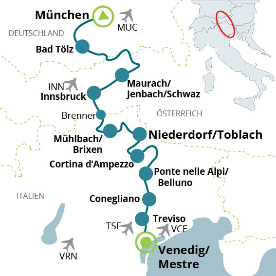 Good train connections from Venice/Mestre to Munich. Timetable available on: www.deutschebahn.de, www.oebb.at, www.trenitalia.com. On request we can offer return transfer from Mestre to München for € 249.00 per person + € 39.00 per own bike, min. 4 people