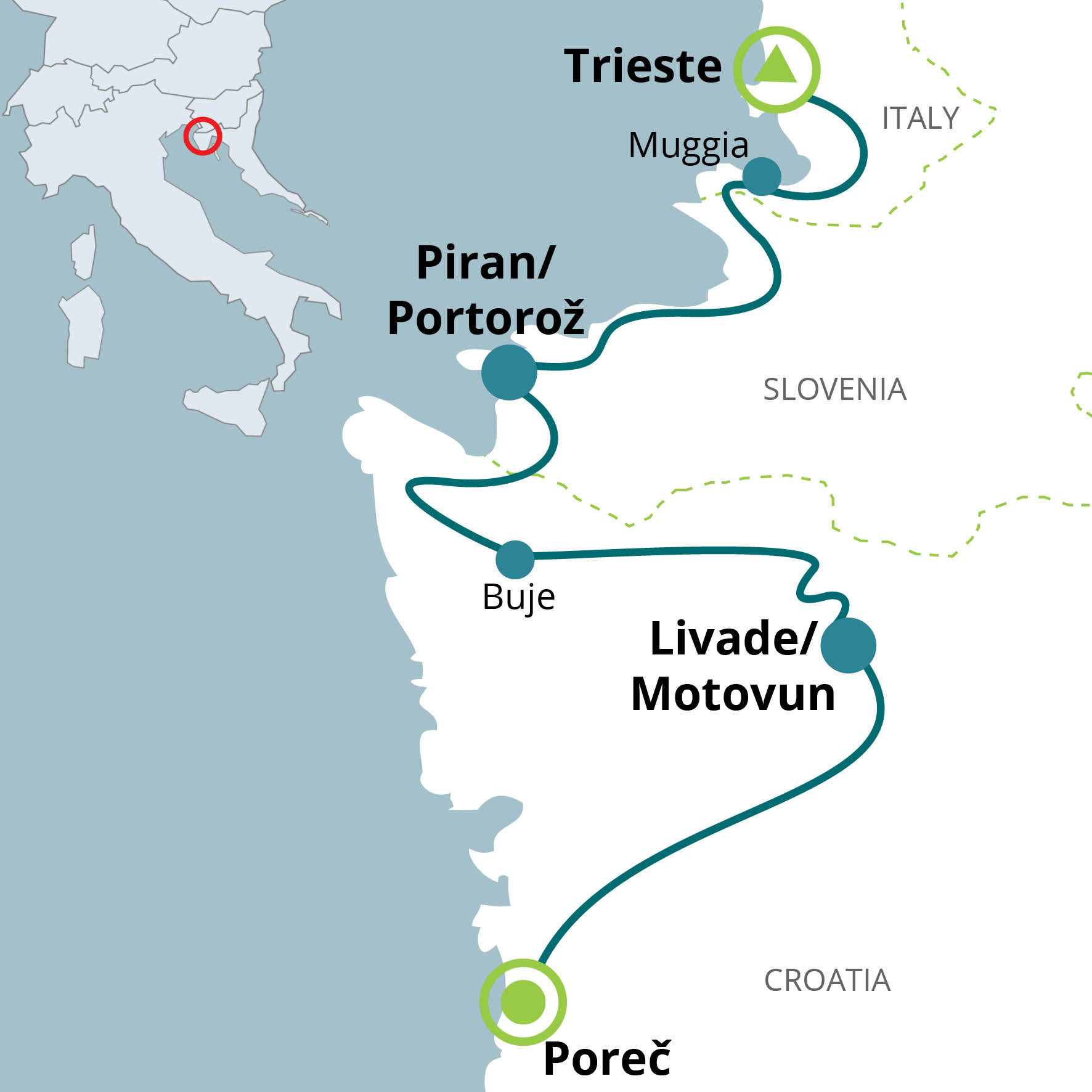 Every Wednesday, Thursday, Saturday and Sunday transfer by minibus from Porec to Trieste at a rate of € 45.00 per person + € 45.00 per each own bike – to be booked and paid in advance.