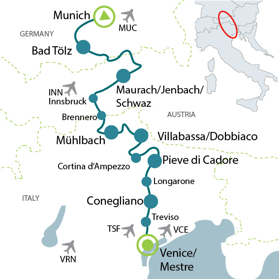 The cycle track „München-Venezia“ joins pure leisure cycling with the adventure of traversing the Alps from Germany over Austria to Italy. On cycling paths, cycle routes or small side roads you will experience three countries with their various regions and lots of outstanding natural and cultural beauties. „München-Venezia“ starts in the capital of Bavaria – Munich – and leads along Bavarian lakes and Tyrolean rivers through the UNESCO world natural heritage – the Dolomites – to Treviso and finally to the gates of the Serenissima – Venice – with its doges palaces and famous canals.