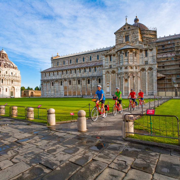 A transfer takes you to the summit of Monte Pisano (900 m / 2,950 ft), where breathtaking views of Pisa and the sea unfold before you. From there, enjoy a thrilling descent into the valley. Cycling alongside a historic Roman aqueduct is an experience in itself—but nothing compares to your arrival at the iconic Leaning Tower of Pisa. The route then leads you to the Mediterranean coast and through the scenic Macchia Lucchese Nature Park, ending in the elegant seaside town of Viareggio—the “pearl of the Tyrrhenian Sea.” You'll return comfortably by train.