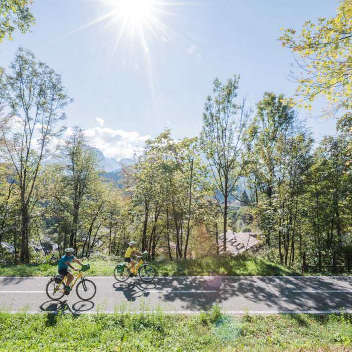 Along the lake with its crystal-clear water, you cycle around the lake for a while and then overcome a small ridge which brings you into the Drau Valley. After this detour, the Alpe-Adria route leads along the leisurely flowing Drava, where some surprises await you. Soon the direction of travel changes and you head south. First along the Gail river, which is ideal for cooling off on hot summer days, and then you cross the border to „Bella Italia“. In the border triangle Austria-Slovenia-Italy lies the small town of Tarvis.