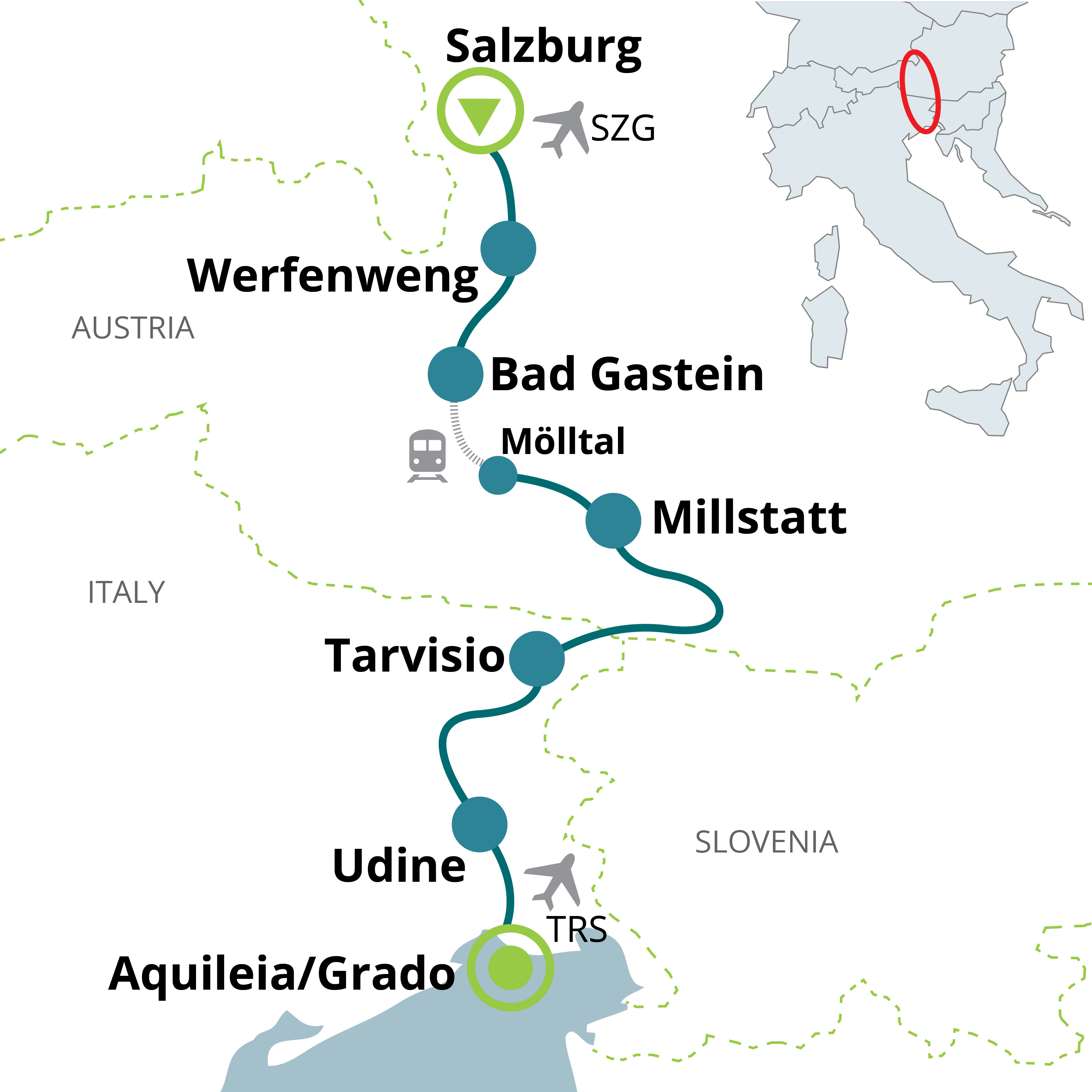 On request return transfer from Grado to Salzburg by shuttle bus every Wednesday, Thursday, Friday, Saturday and Sunday, € 185.00 per person + € 45.00 per own bike, reservation and payment upon booking.