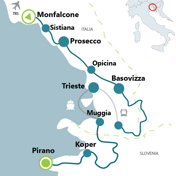 Partendo infatti da Duino avrete modo di salire di quota ed esplorare alcune zone dell’altipiano carsico passando per Opicina e Basovizza. Successivamente inizierete una discesa verso il pittoresco golfo di Trieste attraversando la Riserva Naturale della Val Rosandra. Lasciatevi stupire dall’eleganza ed il fascino mitteleuropeo del capoluogo giuliano che tante persone, fra poeti, scrittori e drammaturghi ha fatto innamorare. Anche l’aspetto culinario gioca un ruolo di primo piano nella caratterizzazione della Venezia Giulia. Il Carso è noto per le “Osmize”, piccole aziende agricole familiari che offrono prodotti tipici, sono spesso immerse nella natura incontaminata dell’altipiano, A Trieste, la città vecchia “Cavana” è ricca di ristoranti con cucina tipica triestina, una fusione di profumi e sapori italiani, austriaci e sloveni, come la famosa zuppa Jota. Un’esperienza culinaria da gustare con un calice di vino o Spritz.