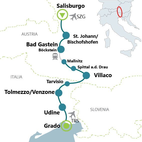 Durante il viaggio incontrerete l‘idilliaca valle del Salzach, Bad Gastein, l‘imponente paesaggio montuoso degli Alti Tauri, la soleggiata Trautal e la tranquilla Carinzia. Pedalando sulla Via Augusta e passato il confine scoprirete il Friuli Venezia Giulia incontrando le bellissime e storiche città di Palmanova e Aquileia per arrivare infine a Grado, nota località balneare.