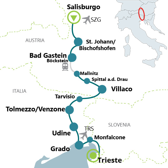 Un affascinante percorso che in una settimana oltrepassa le Alpi e arriva al Mare Adriatico! Può sembrare un‘impresa, ma grazie al percorso perfettamente segnalato della ciclabile Alpe Adria la riuscita è assicurata! L‘ascesa al punto più alto del percorso è infatti divisa su due giornate e l‘ultimo tratto viene percorso in treno. Durante il viaggio incontrerete l‘idilliaca valle del Salzach, Bad Gastein, l‘imponente paesaggio montuoso degli Alti Tauri, la soleggiata Trautal e la tranquilla Carinzia. Pedalando sulla Via Augusta e passato il confine scoprirete il Friuli Venezia Giulia incontrando le bellissime e storiche città di Palmanova e Aquileia per arrivare infine a Trieste.