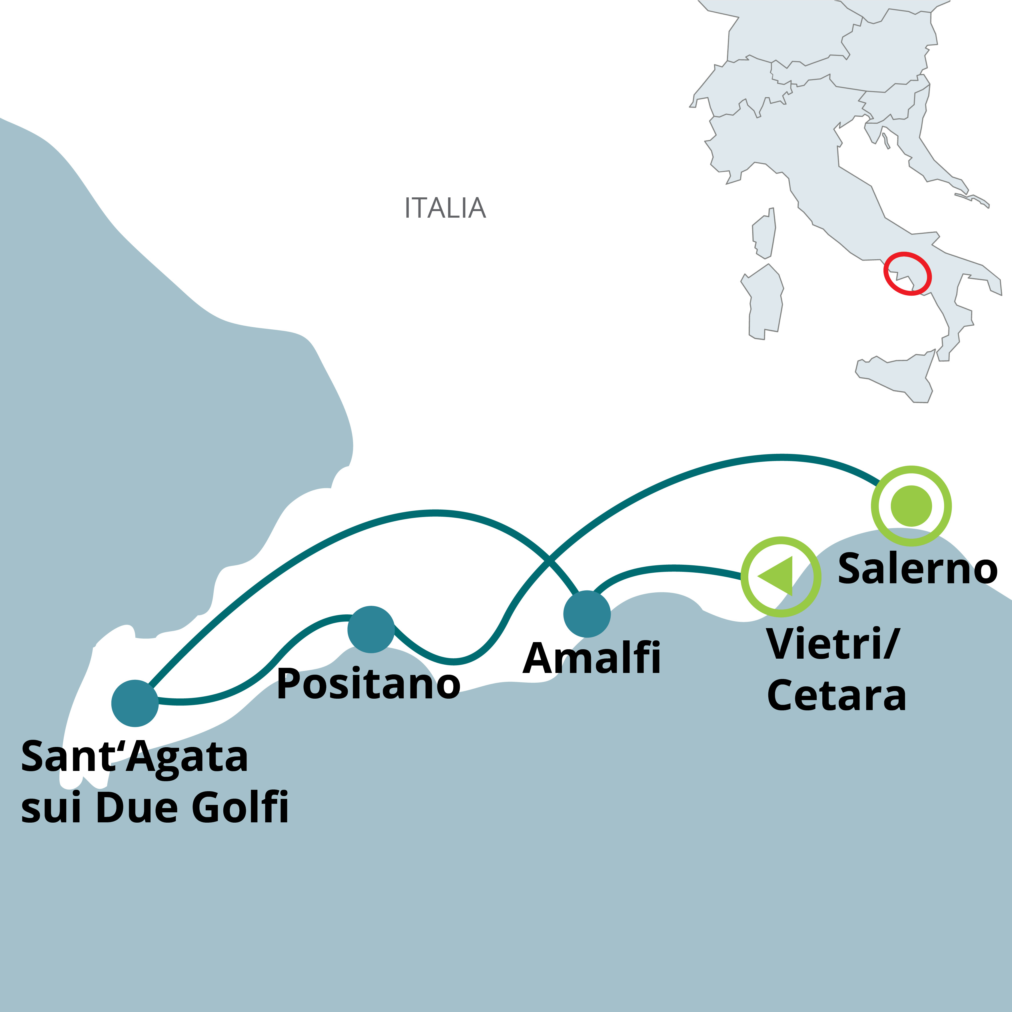 Il tour parte inizia a Vietri o Cetara, porta di ingresso della costiera amalfitana: pedalando lungo la costa giungerete fino all’estremità della penisola sorrentina, Punta Campanella e da lì farete tappa nella mondana Positano per poi terminare il vostro giro a Cetara o Salerno. I piccoli paesini che incontrerete lungo il percorso vi offriranno diverse opportunità di visita: il Duomo di Amalfi con il suo affascinante Chiostro del Paradiso, la Valle dei Mulini con i resti degli antichi mulini un tempo destinati alla produzione della pregiata carta d’Amalfi. Potrete passeggiare nei giardini di Villa Cimbrone di Ravello o perdervi nel fitto dedalo di stradine del centro storico di Sorrento. Pedalare lungo questo tratto di costa sarà davvero un’esperienza indimenticabile! Un tour di media difficoltà adatto a chiu ha un minimo di allenamento ed è in buone condizioni fisiche. Tappe moderate con alcune salite iù lunghe; l‘itinerario segue quasi interamente strade asfaltate a basso traffico, tranne nei mesi estivi o periodi di vacanza quando c‘è maggiore affluenza. Alcune tappe prevedono la possibilità di scegliere un percorso più lungo.