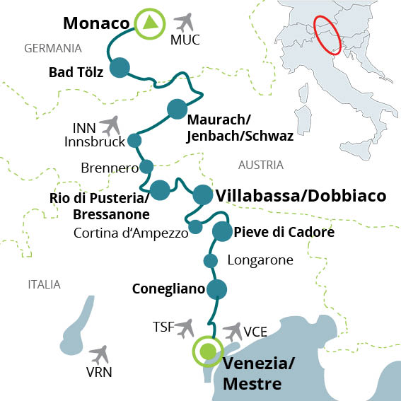 La ciclovia “Monaco – Venezia” è un itinerario molto vario che attraversa 5 regioni, un‘esperienza che coniuga il piacere di viaggiare in bici e l’avventura di attraversare le Alpi partendo dalla Germania, proseguire in Austria e arrivare infine all’Adriatico in Italia. Su piste ciclabili, itinerari pensati per le biciclette e strade secondarie scoprirete le molteplici e straordinarie bellezze naturali e culturali di questi 3 Paesi. La ciclovia inizia nella metropoli più a sud della Germania, Monaco, costeggia i laghi bavaresi e segue il fiume Inn attraverso la valle tirolese; scoperta poi la magnificenza delle Dolomiti – Patrimonio Naturale dell’Umanità UNESCO – raggiungerete Treviso ed infine la città lagunare di Venezia con i suoi canali e palazzi storici. Una alternanza unica di grandi città e piccoli villaggi romantici, laghi , vallate, castelli e fortezze…impossibile non appasionarsi a questo percorso!