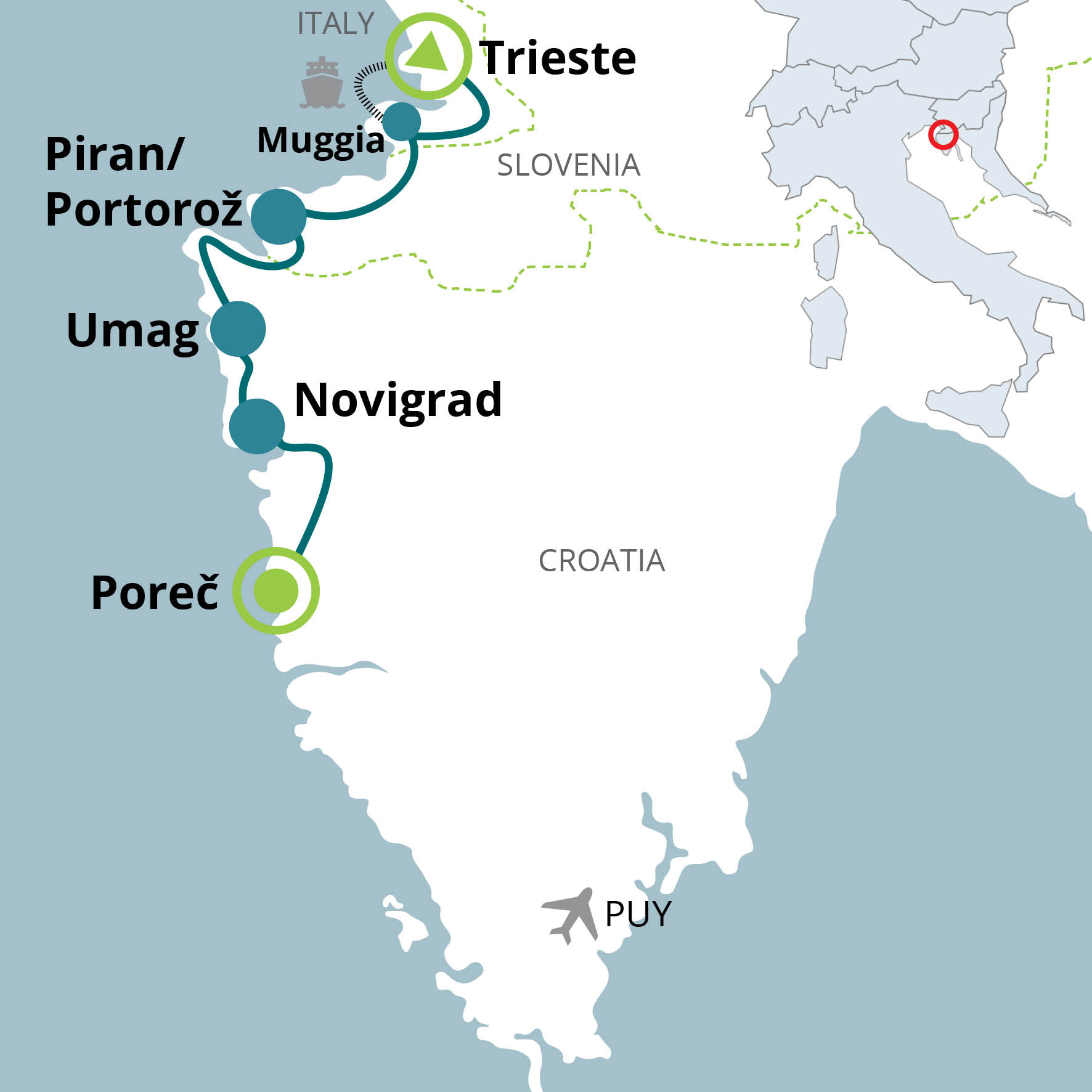 Trieste, punto di incontro tra i popoli del Mediterraneo e quelli del Centro Europa, primo porto per l’impero asburgico nel XVI sec., è il punto di partenza di questo viaggio. Oggi Trieste è una vivace città di confine ricca di monumenti, chiese, musei e palazzi. Il percorso lascia l’Italia per pedalare prima attraverso la Slovenia e poi lungo la colorata costa croata. Questa soleggiata penisola nell’Adriatico è un pittoresco insieme di villaggi di pescatori, piccole città, colline carsiche,
